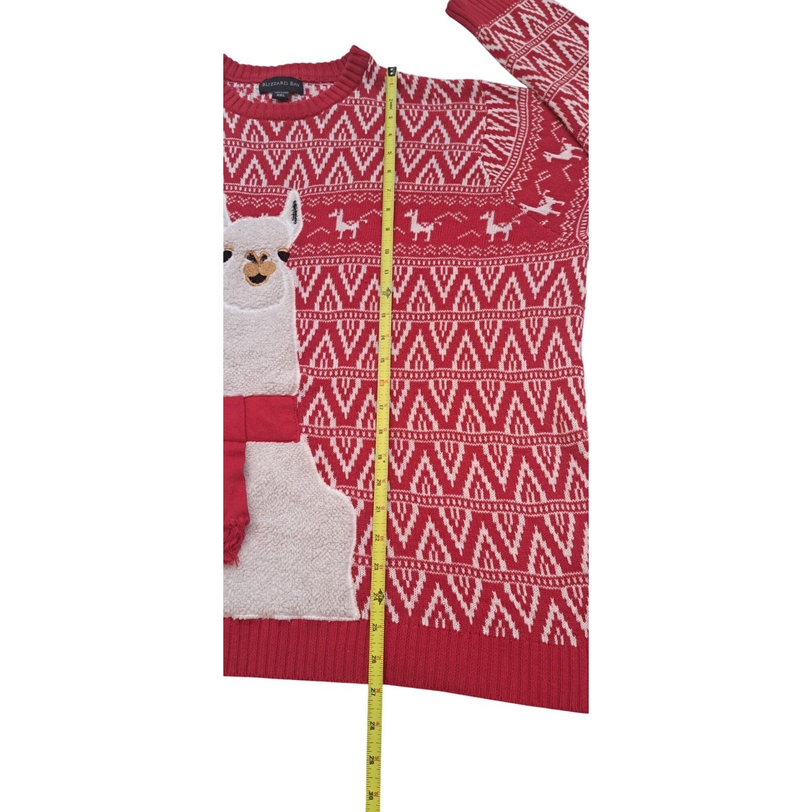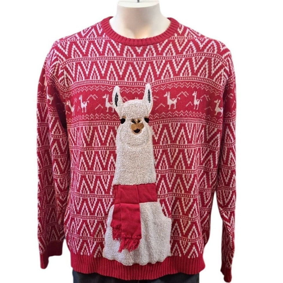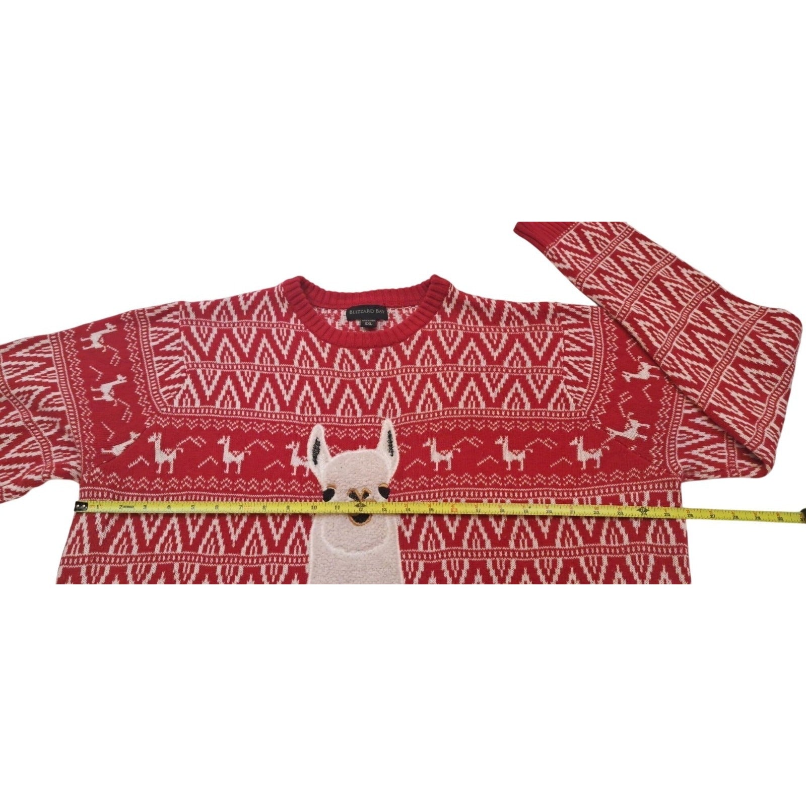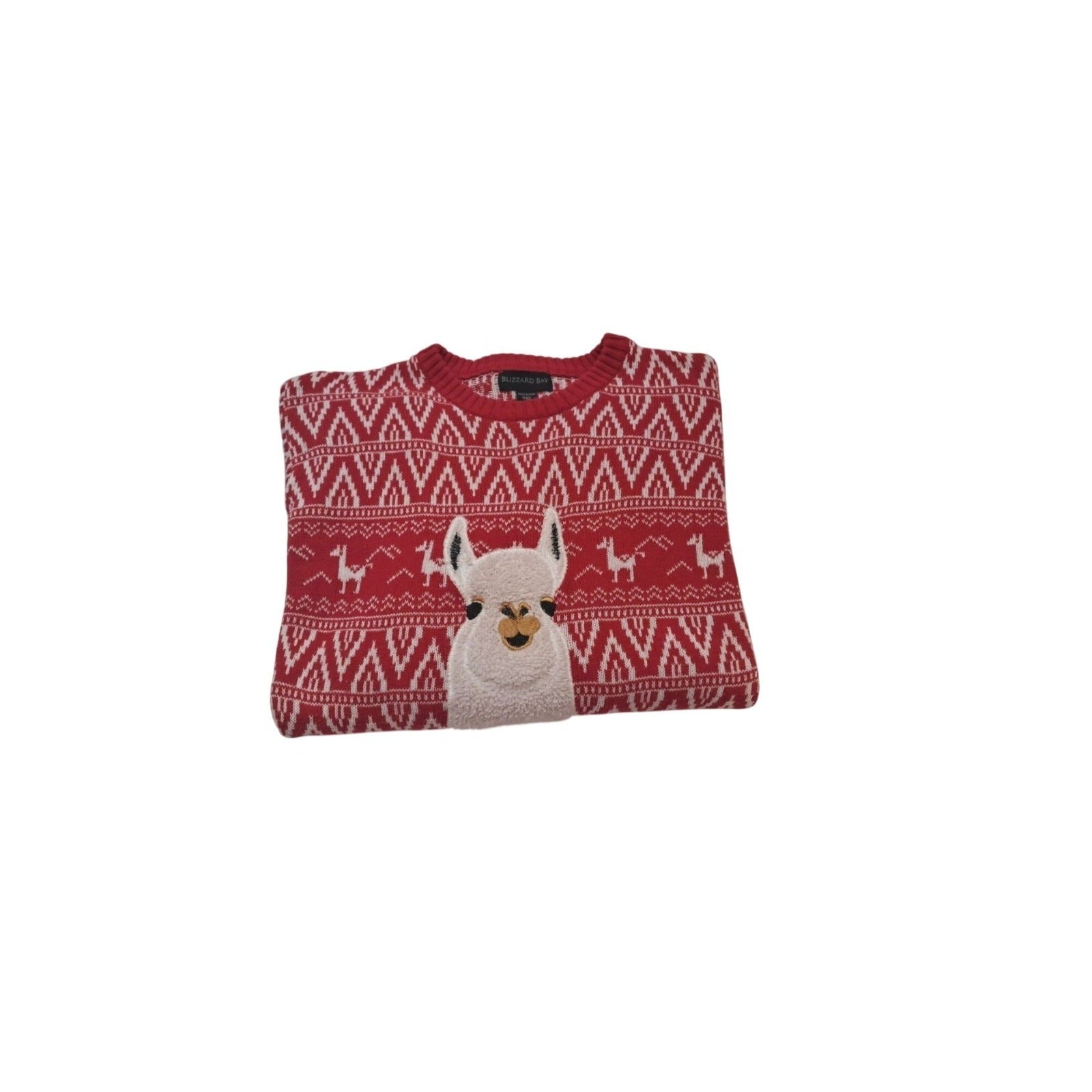 Blizzard Bay Red XXL Ugly Christmas Sweater featuring a festive llama with a scarf. This cheerful sweater offers warmth and playful holiday style with its vibrant red color and soft, comfortable knit material โ perfect for seasonal gatherings.