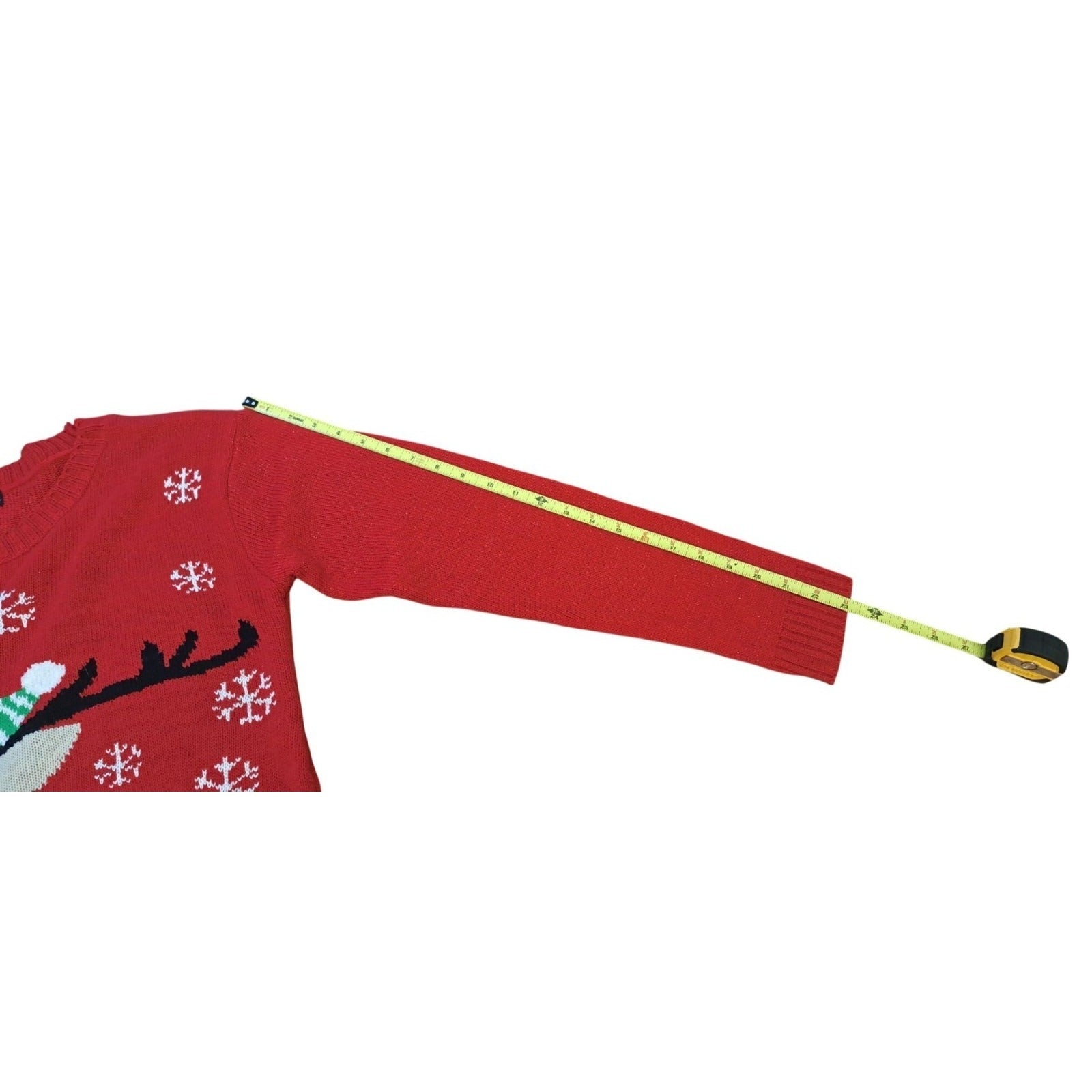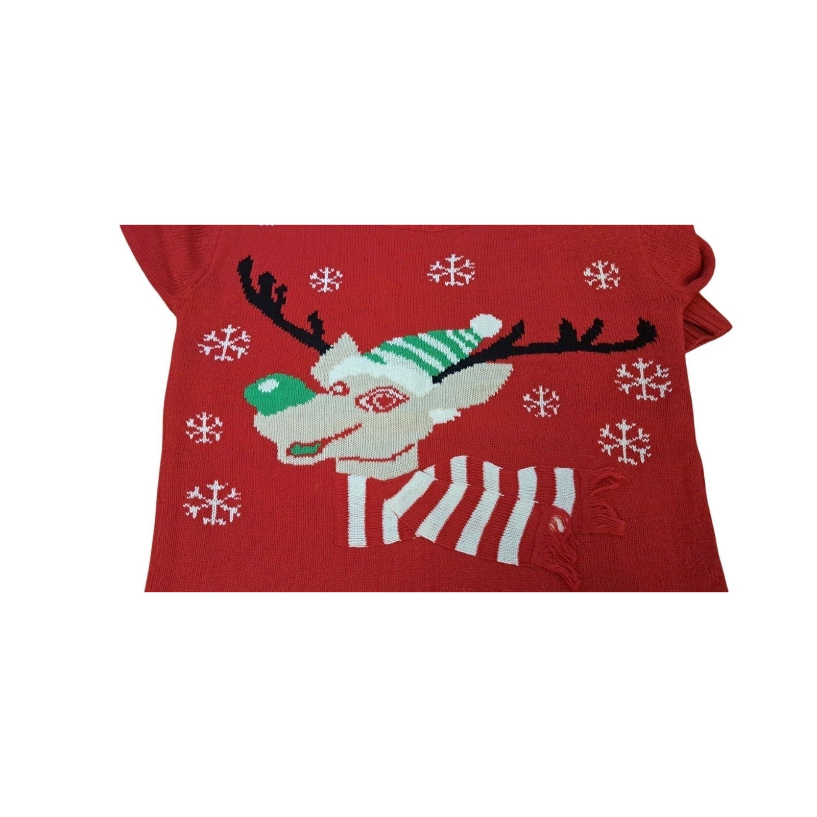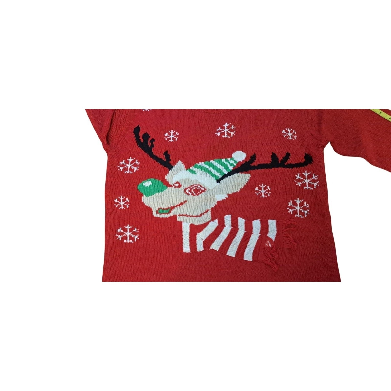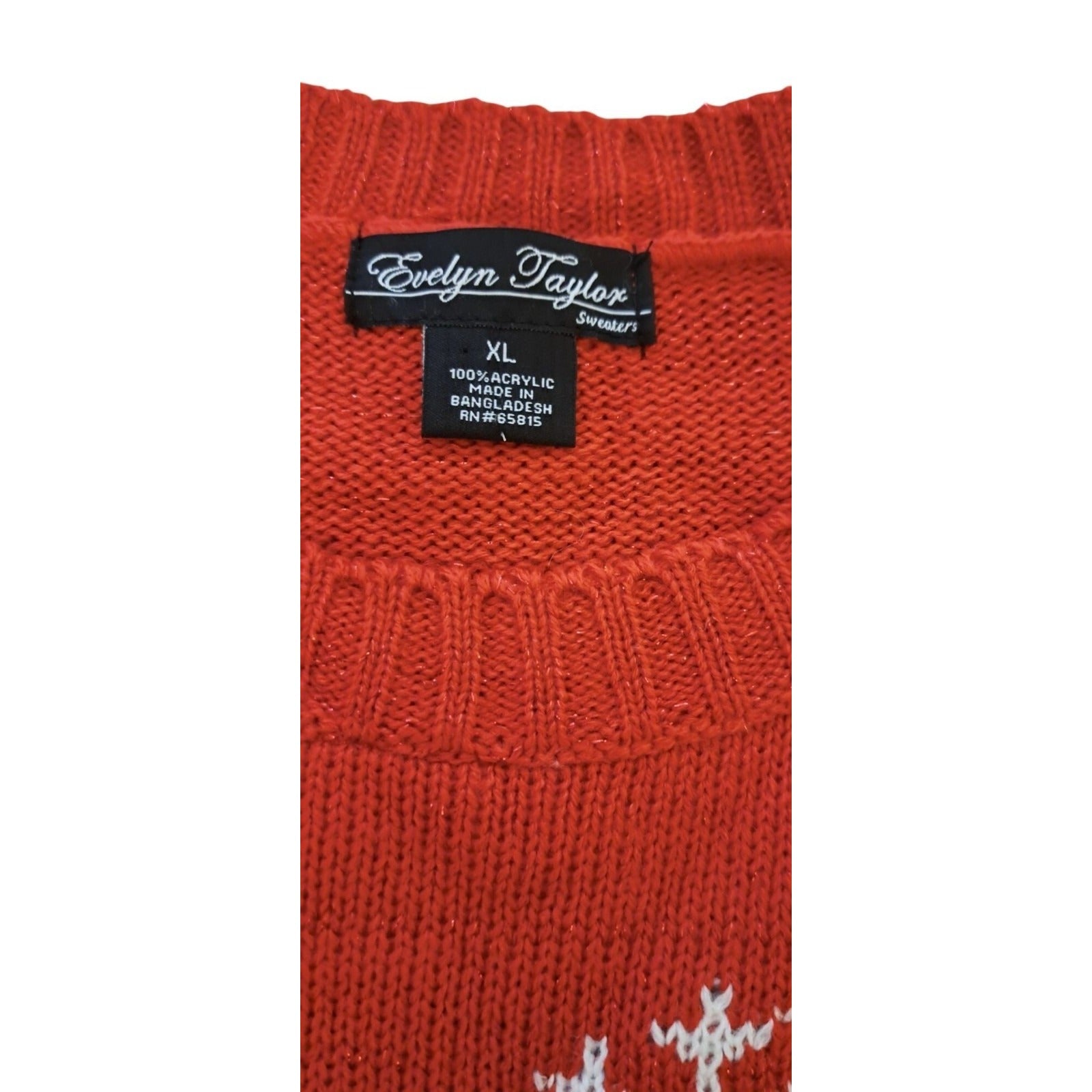 Evelyn Taylor Women’s XL Red Reindeer Ugly Christmas Sweater. This festive sweater features a cheerful reindeer design with snowflakes on a vibrant red backdrop. Crafted from soft acrylic, it provides warmth and durability.