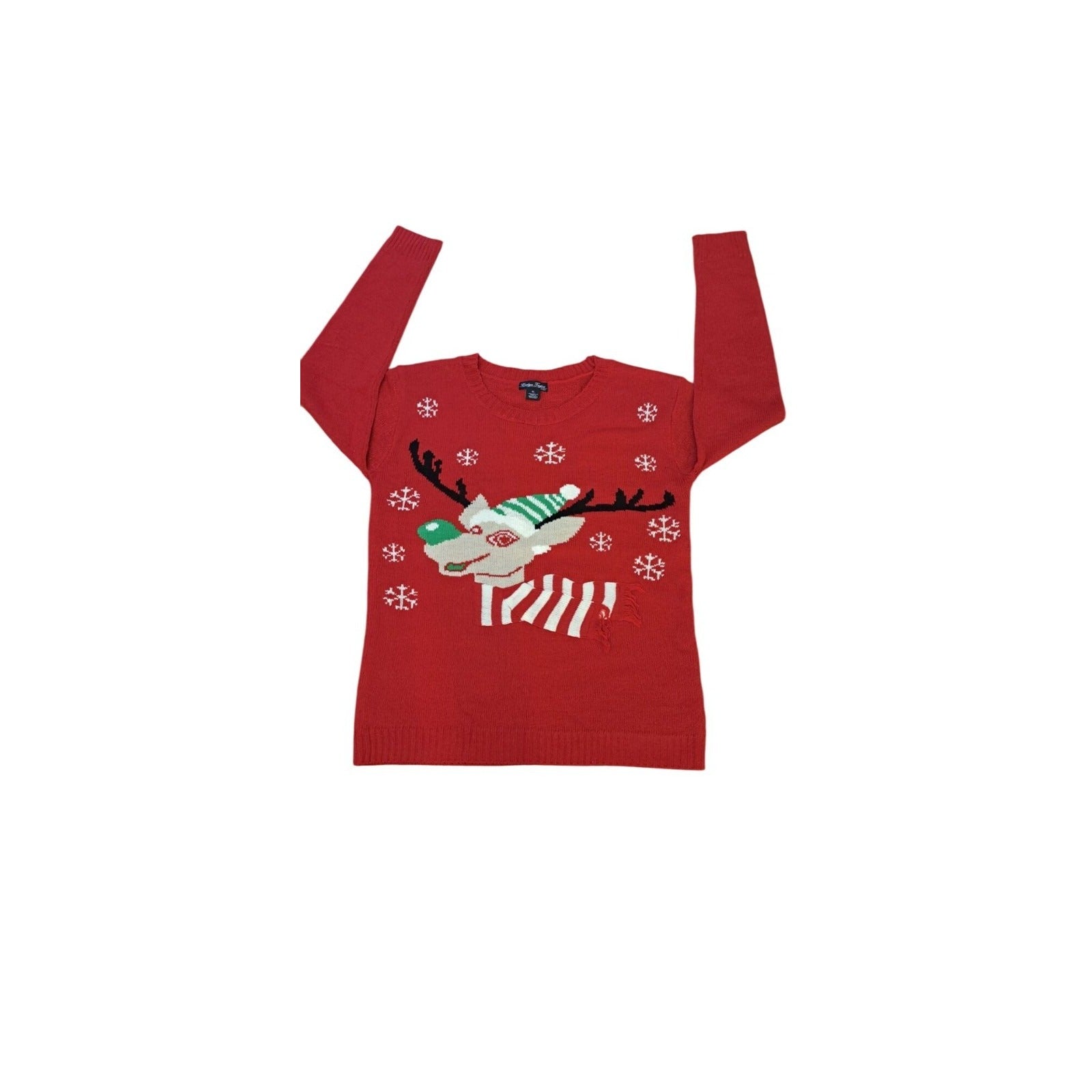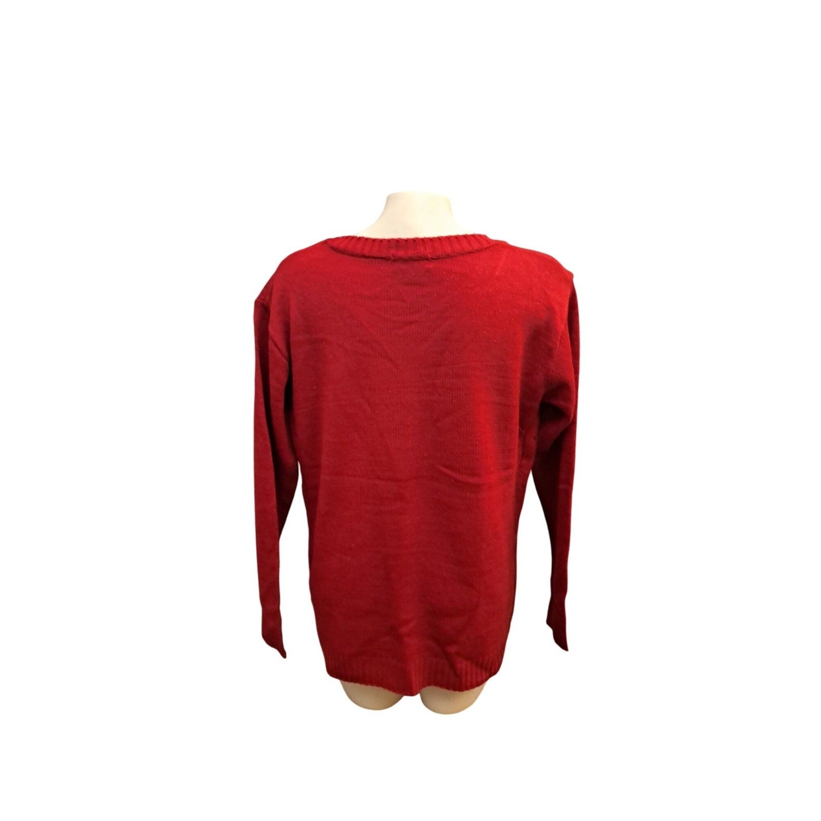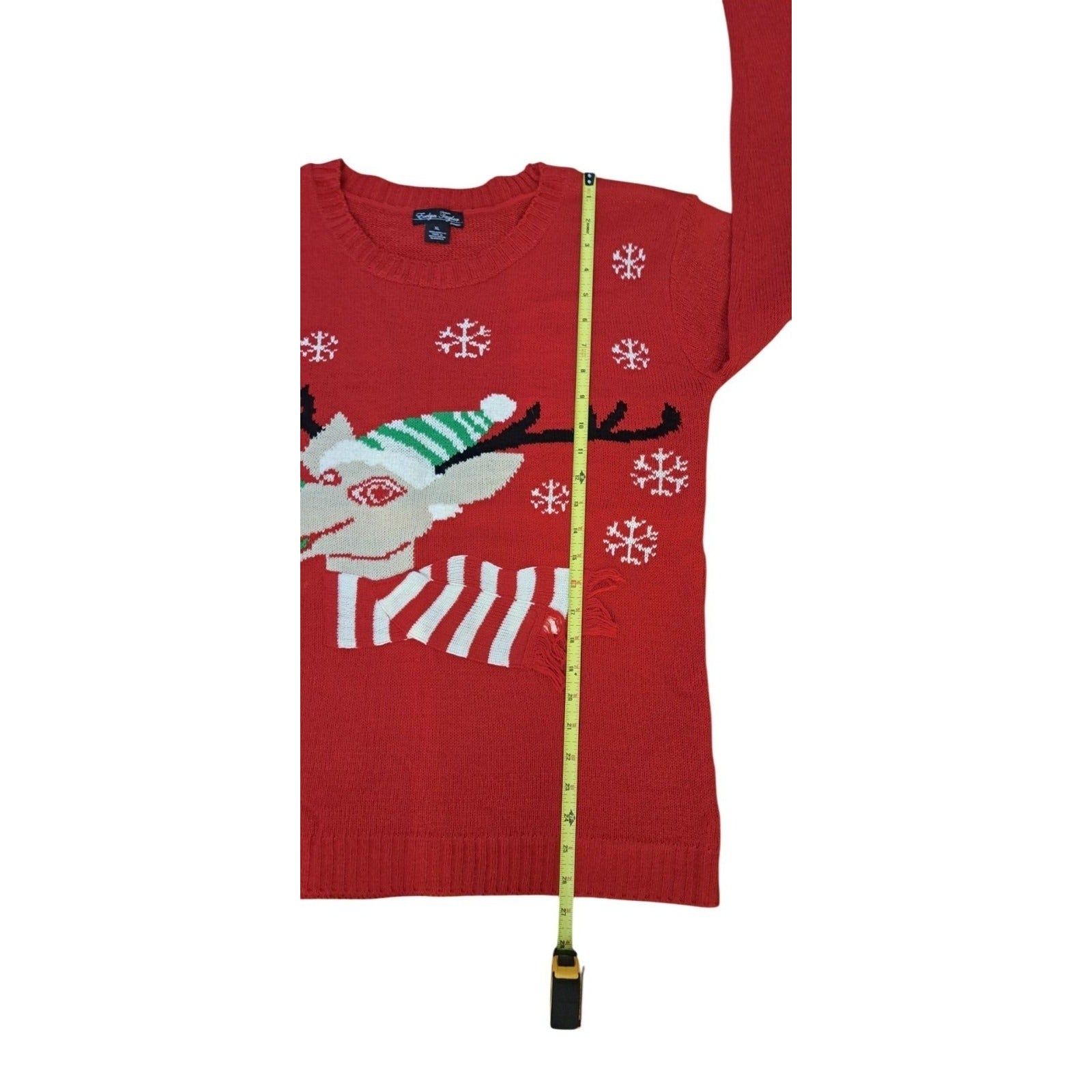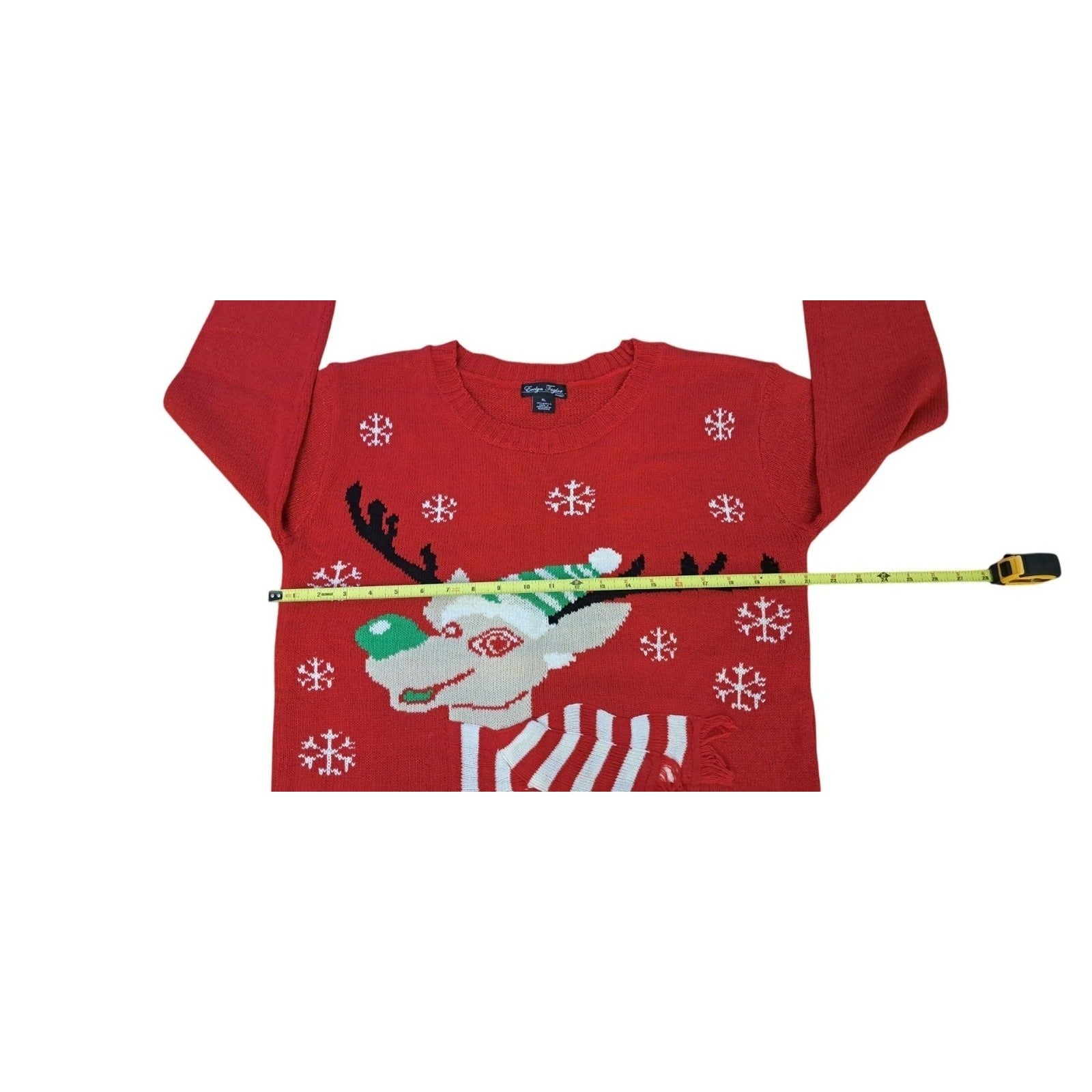 Evelyn Taylor Women’s XL Red Reindeer Ugly Christmas Sweater. This festive sweater features a cheerful reindeer design with snowflakes on a vibrant red backdrop. Crafted from soft acrylic, it provides warmth and durability.