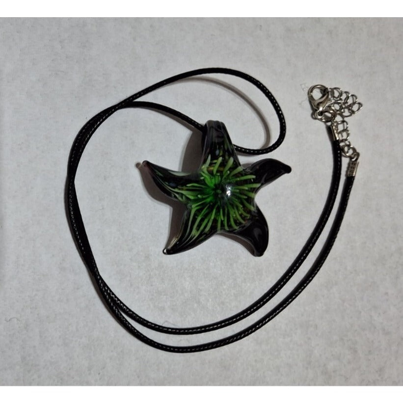 This hand-blown glass pendant necklace features a striking star/flower design with a swirling green interior set against deep black glass. Artistic and nature-inspired, it makes a bold statement while remaining lightweight and comfortable to wear. Pre-owned and in excellent condition, this piece is perfect for boho, artisan, or handcrafted jewelry lovers.