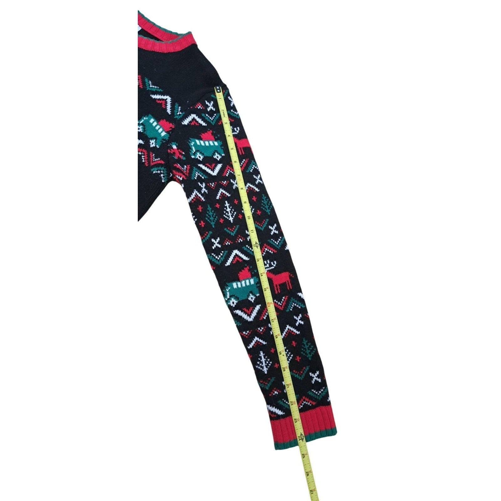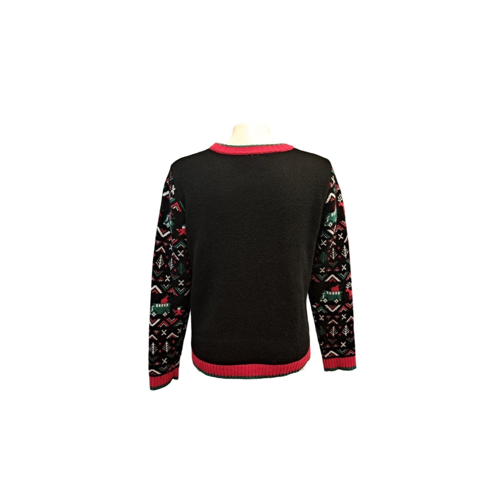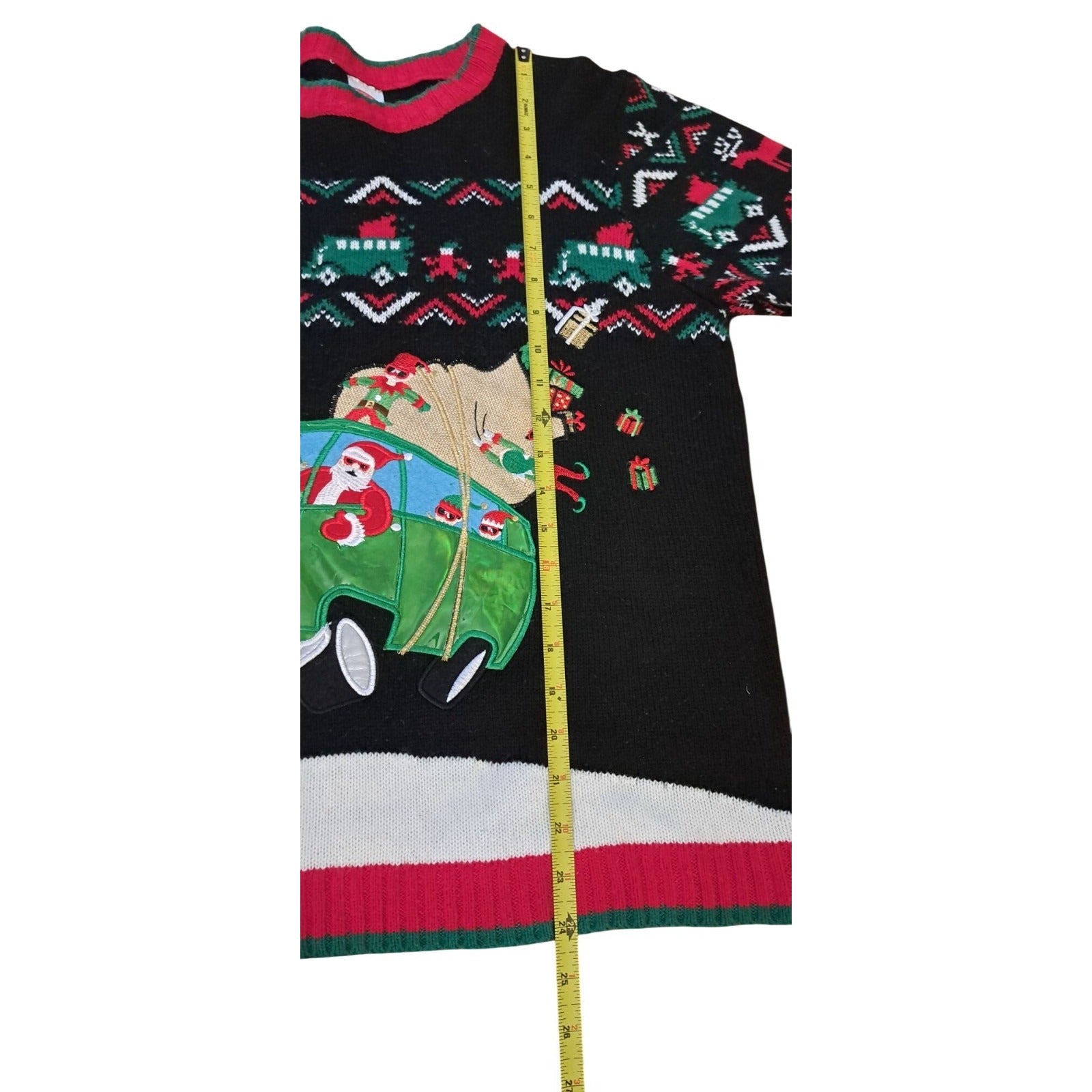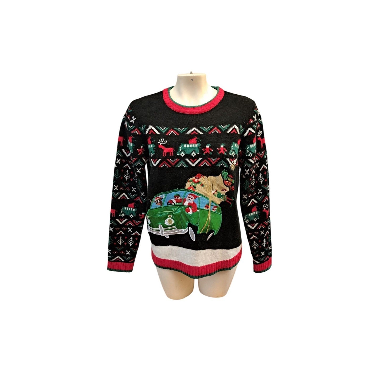 This Christmas sweater showcases a festive design featuring Santa, reindeer, and a car applique. Its knit material ensures comfort and warmth for any holiday gathering.