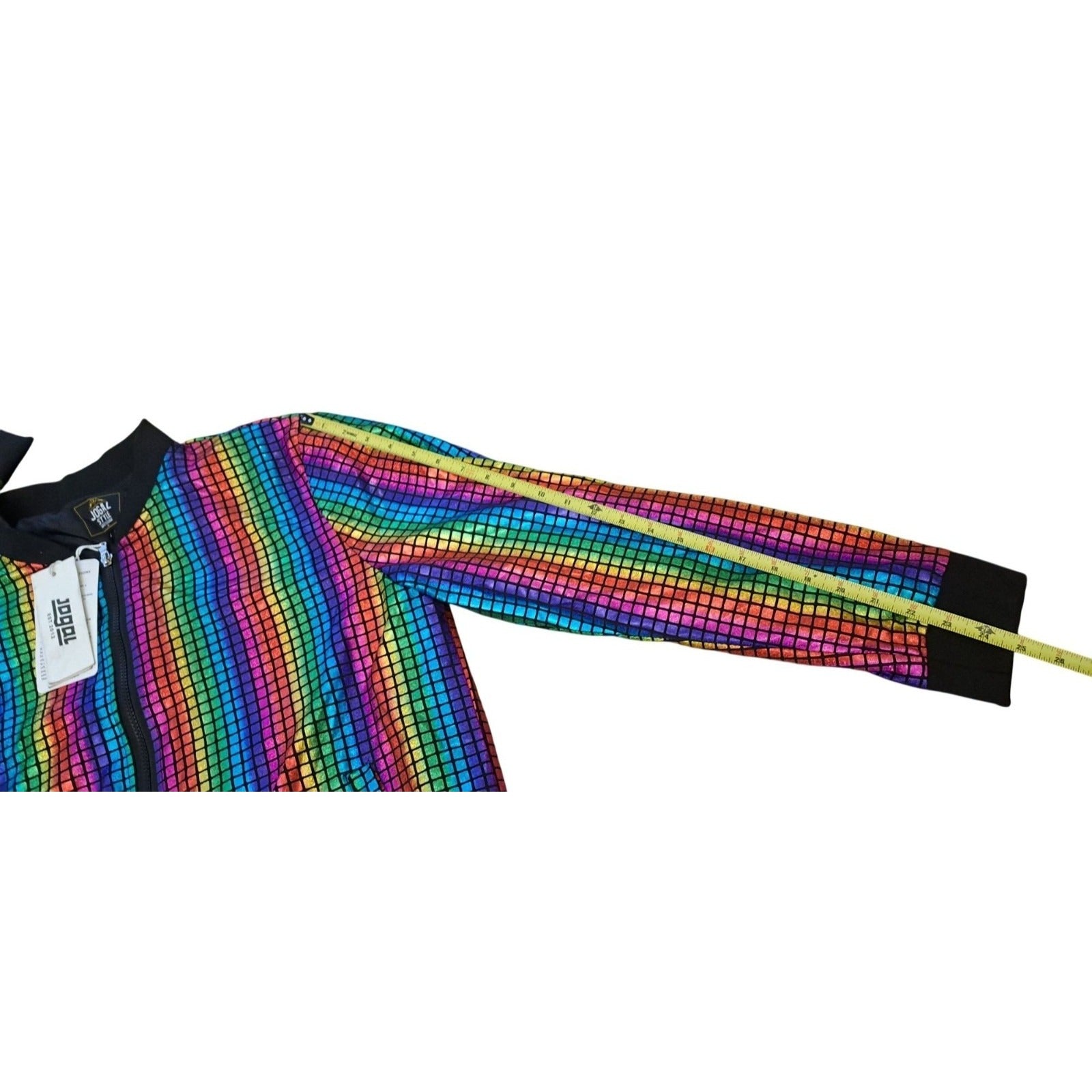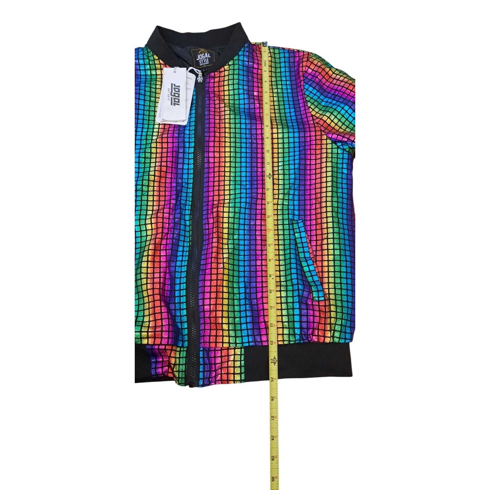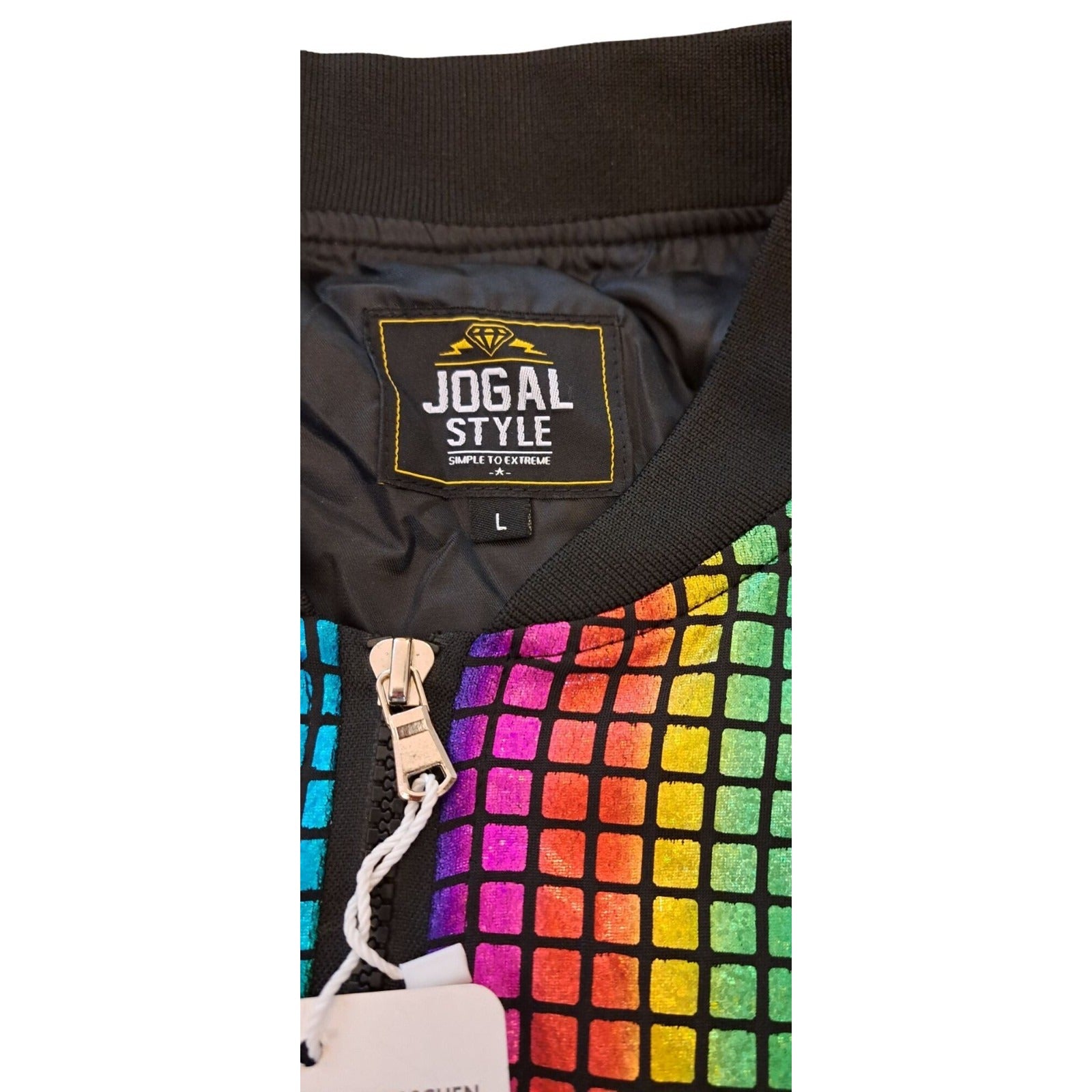 Jogal Style Unisex Metallic RAINBOW Holographic Disco Costume Jacket L LargeThis vibrant rainbow sequin bomber jacket is designed for men seeking a bold fashion statement. The black ribbed trim enhances its sleek and polished appearance.