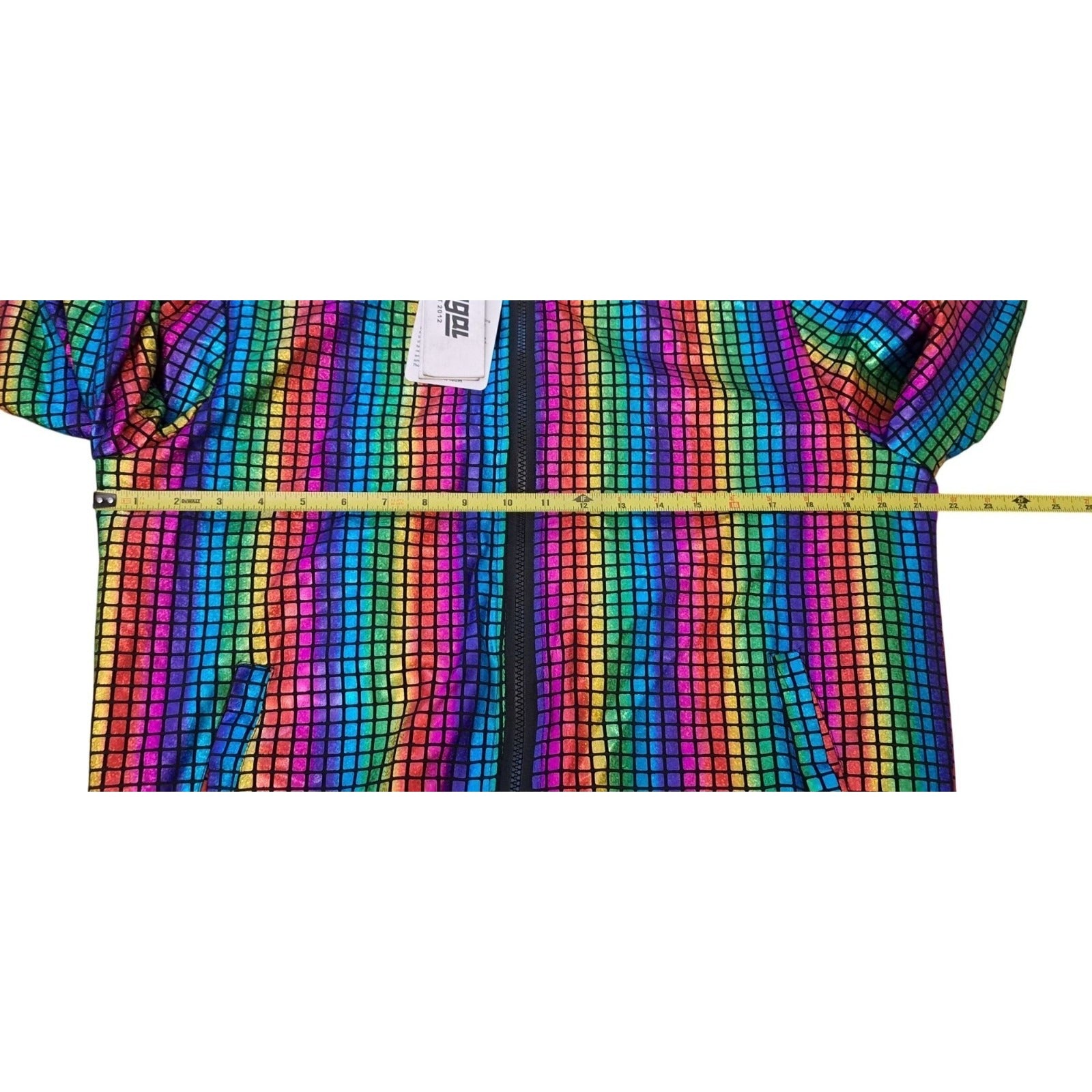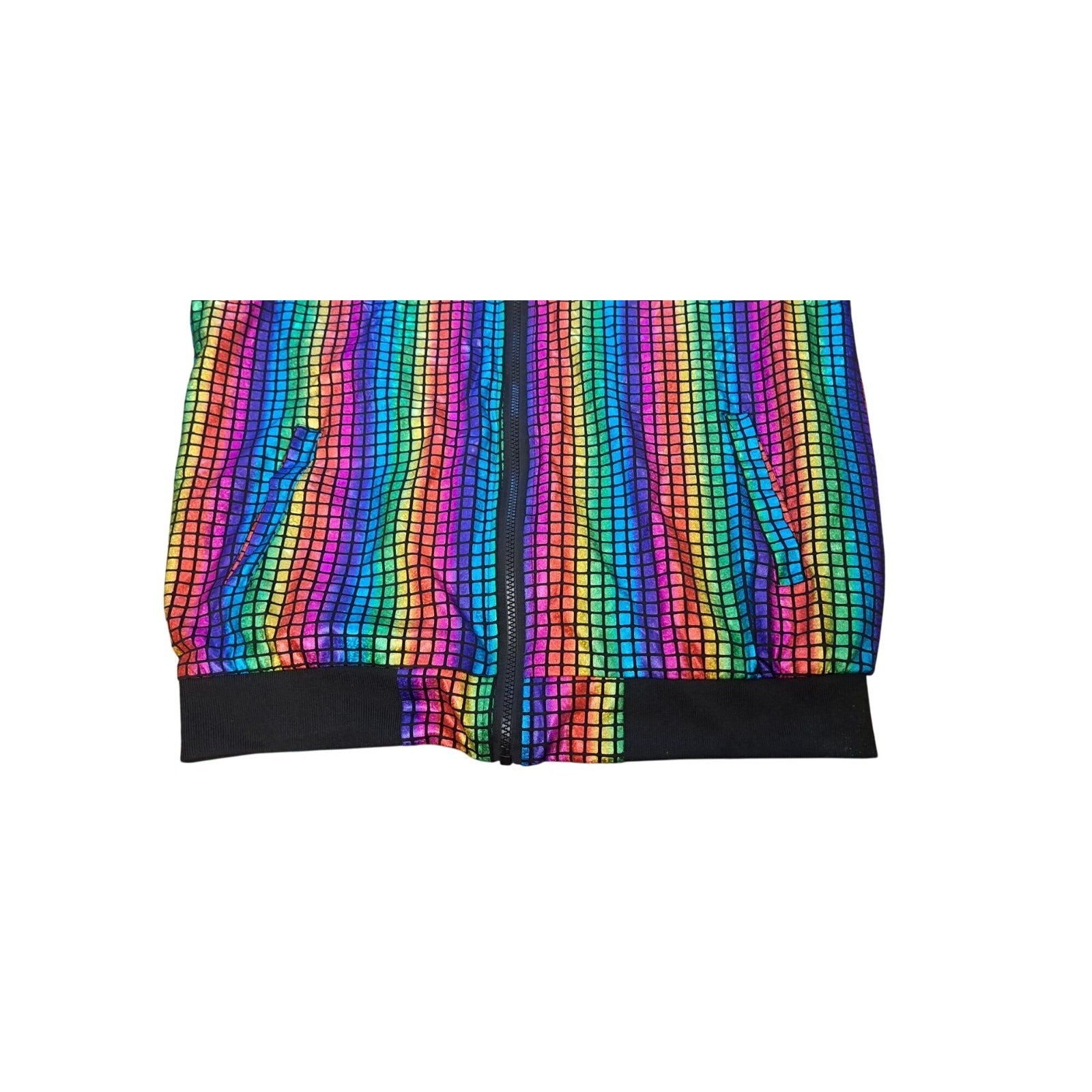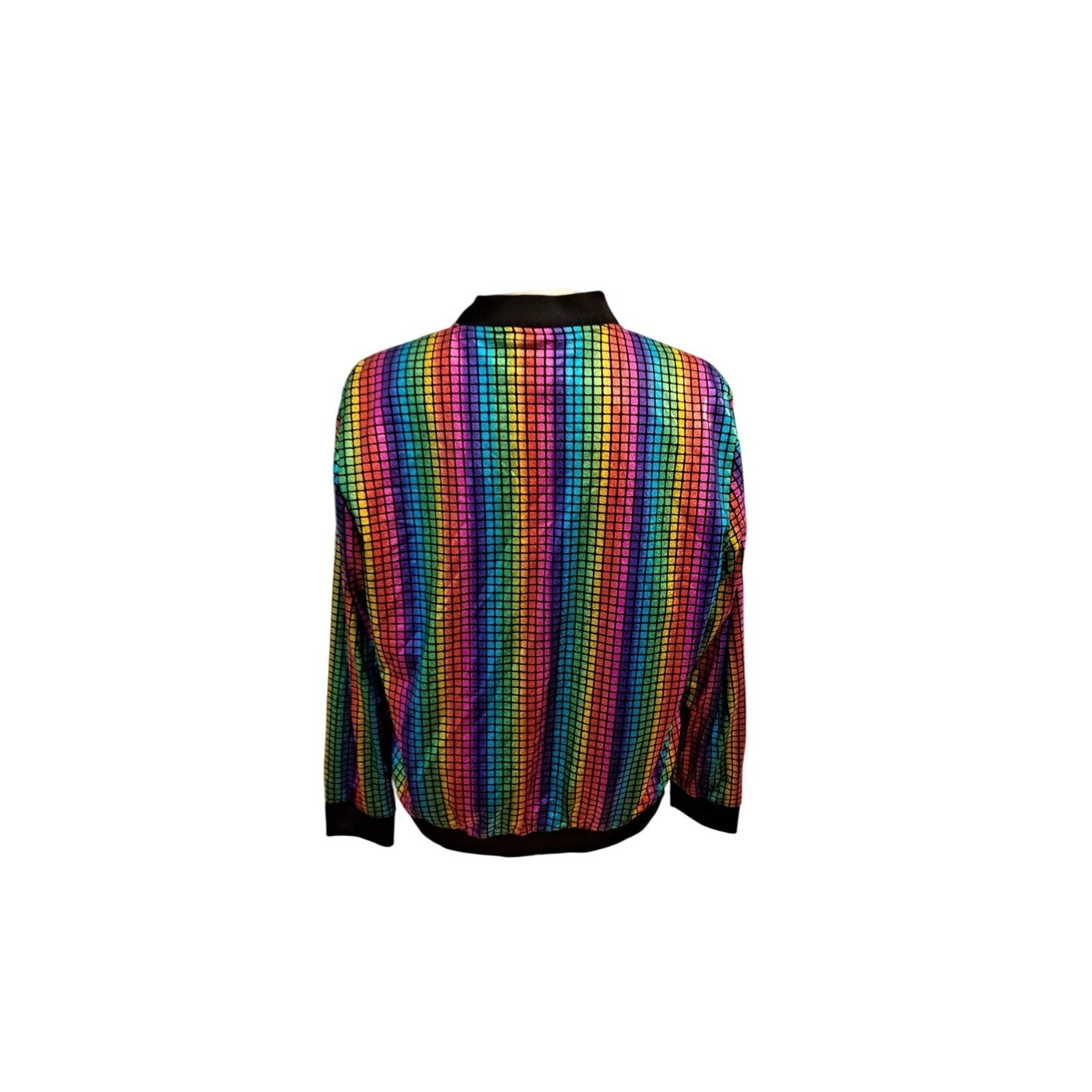Jogal Style Unisex Metallic RAINBOW Holographic Disco Costume Jacket L LargeThis vibrant rainbow sequin bomber jacket is designed for men seeking a bold fashion statement. The black ribbed trim enhances its sleek and polished appearance.