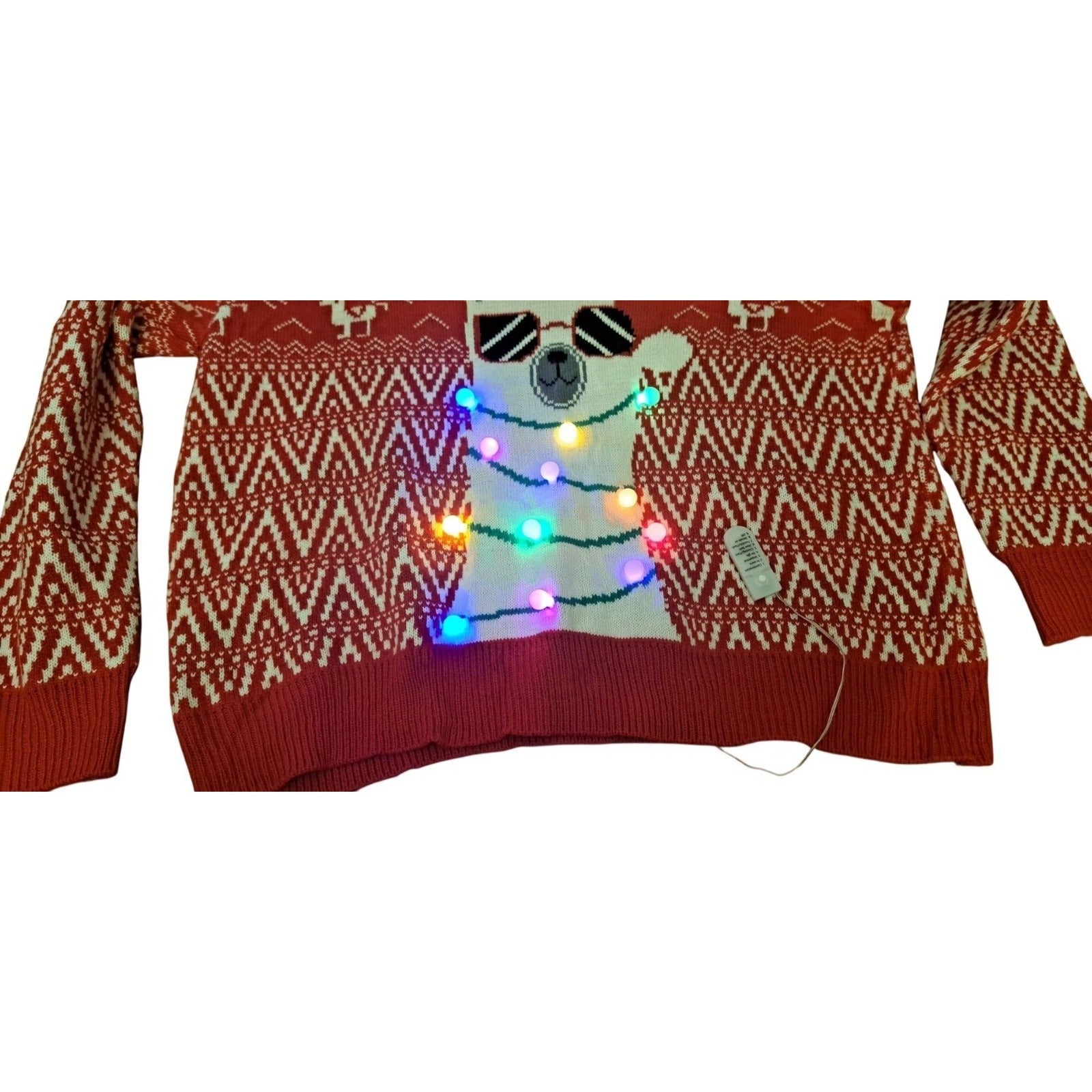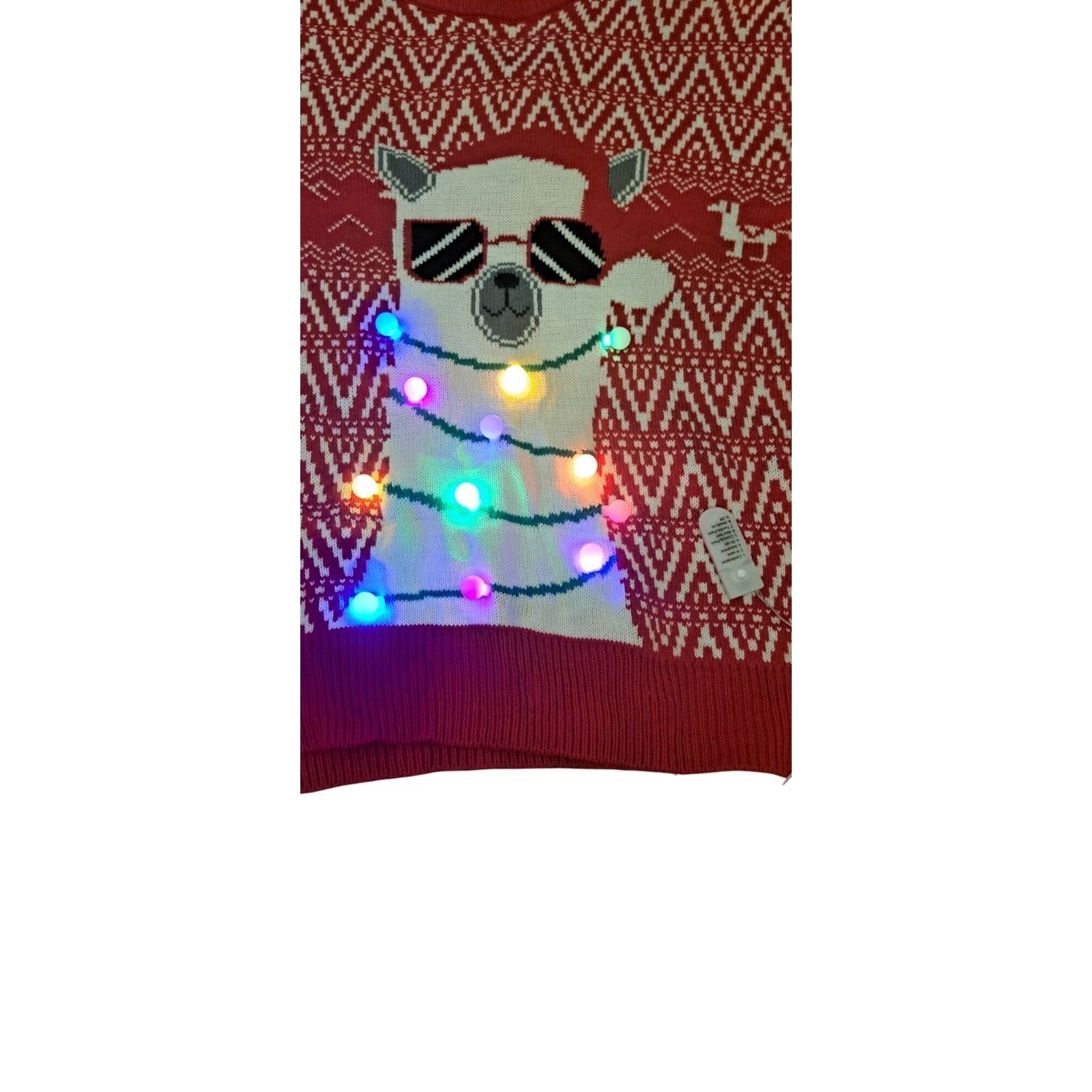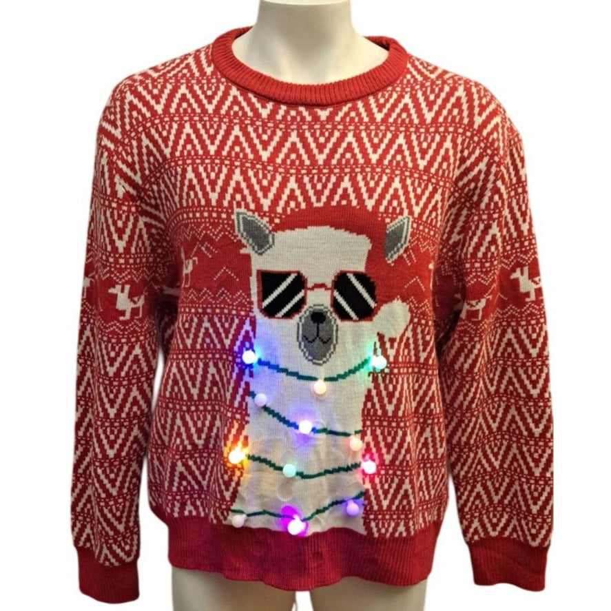 Llama with Sunglasses and LED Lights Red XXL Ugly Christmas Sweater. This festive red sweater features a fun llama design wearing sunglasses and wrapped in LED lights—perfect for holiday parties or cheerful gatherings.