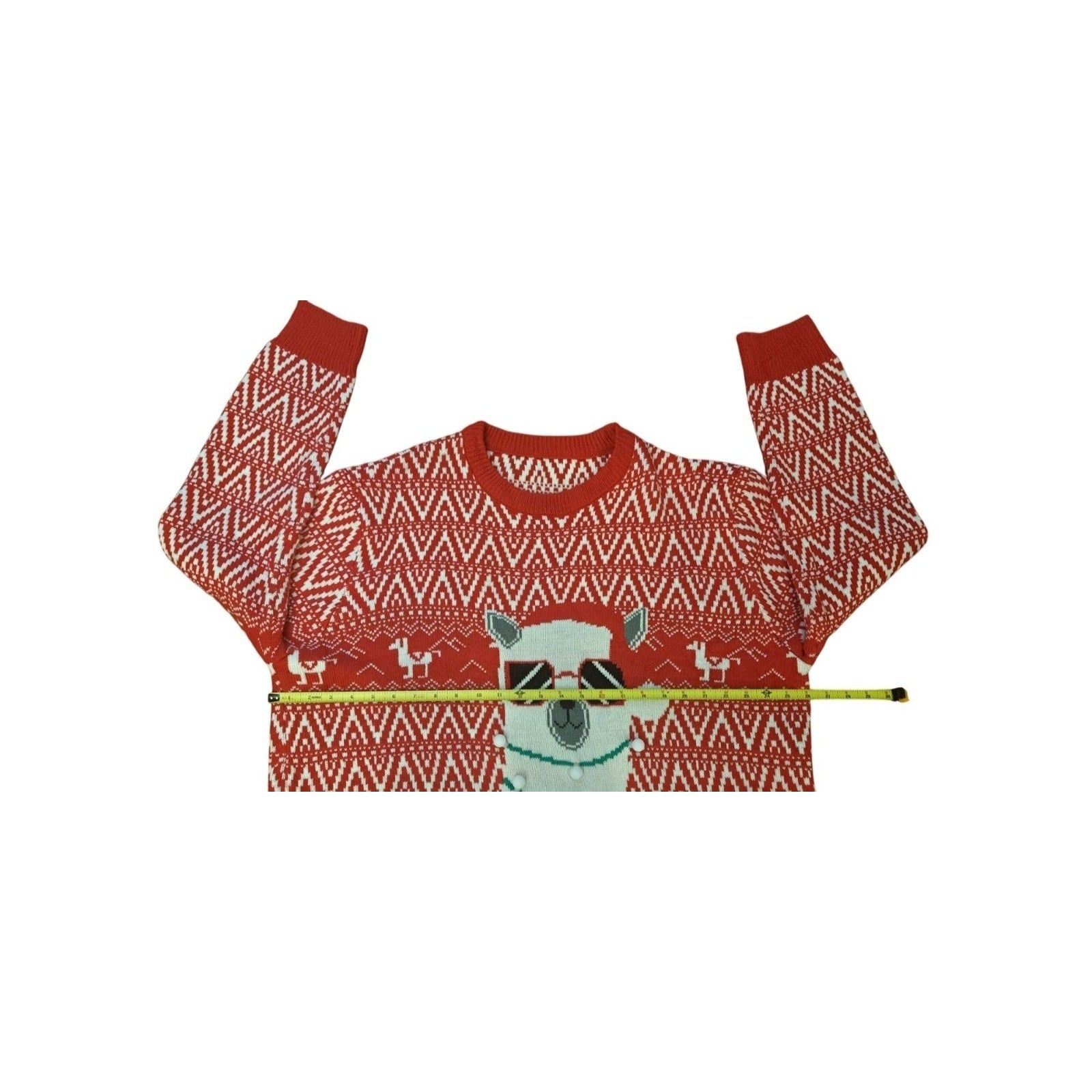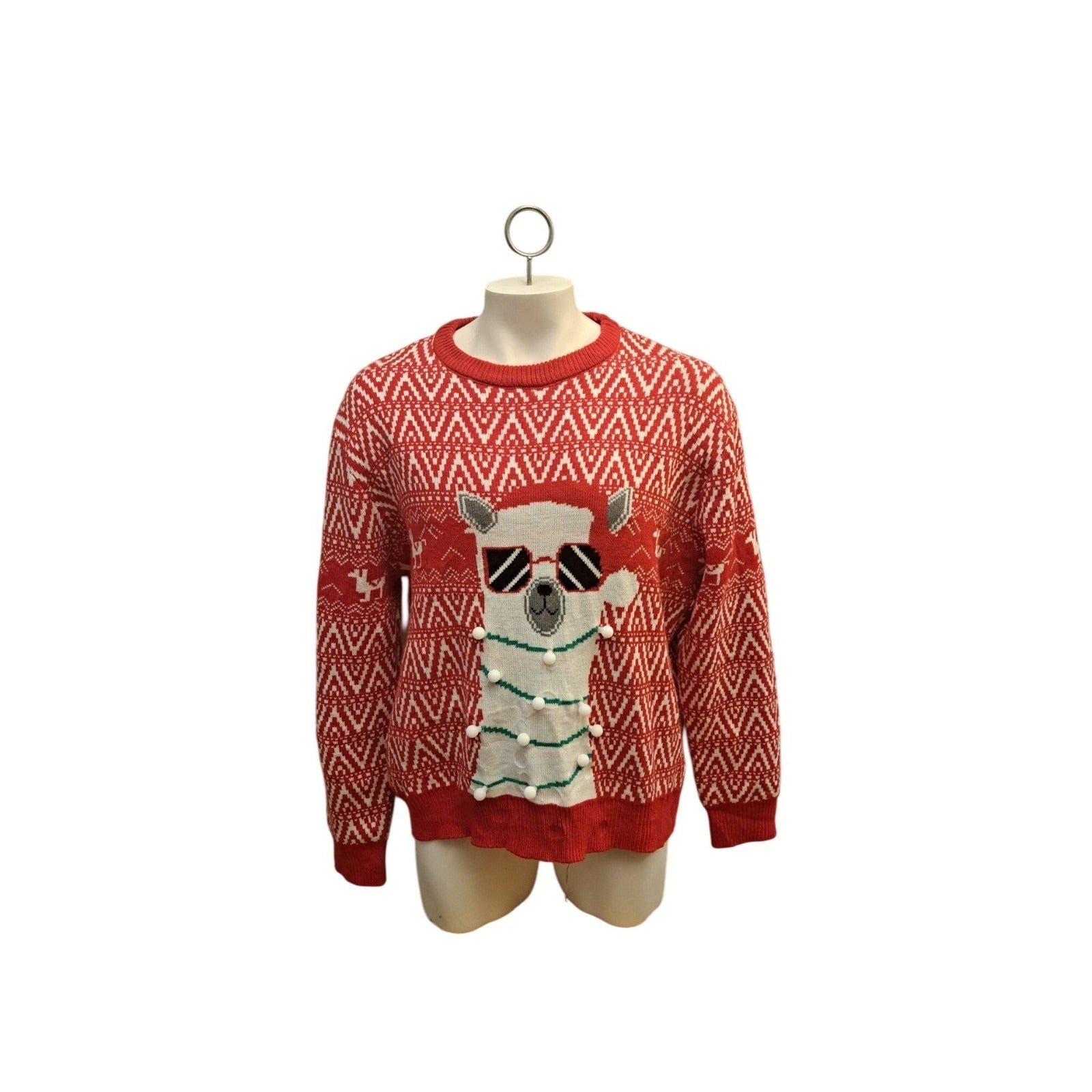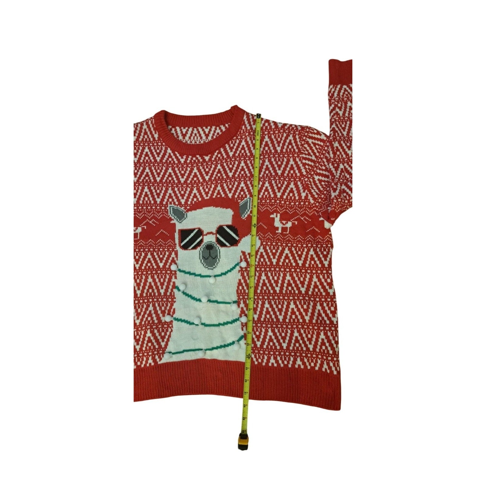 Llama with Sunglasses and LED Lights Red XXL Ugly Christmas Sweater. This festive red sweater features a fun llama design wearing sunglasses and wrapped in LED lights—perfect for holiday parties or cheerful gatherings.