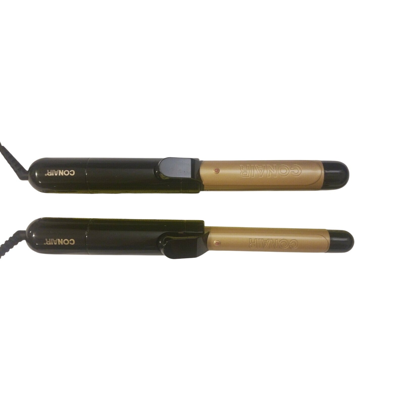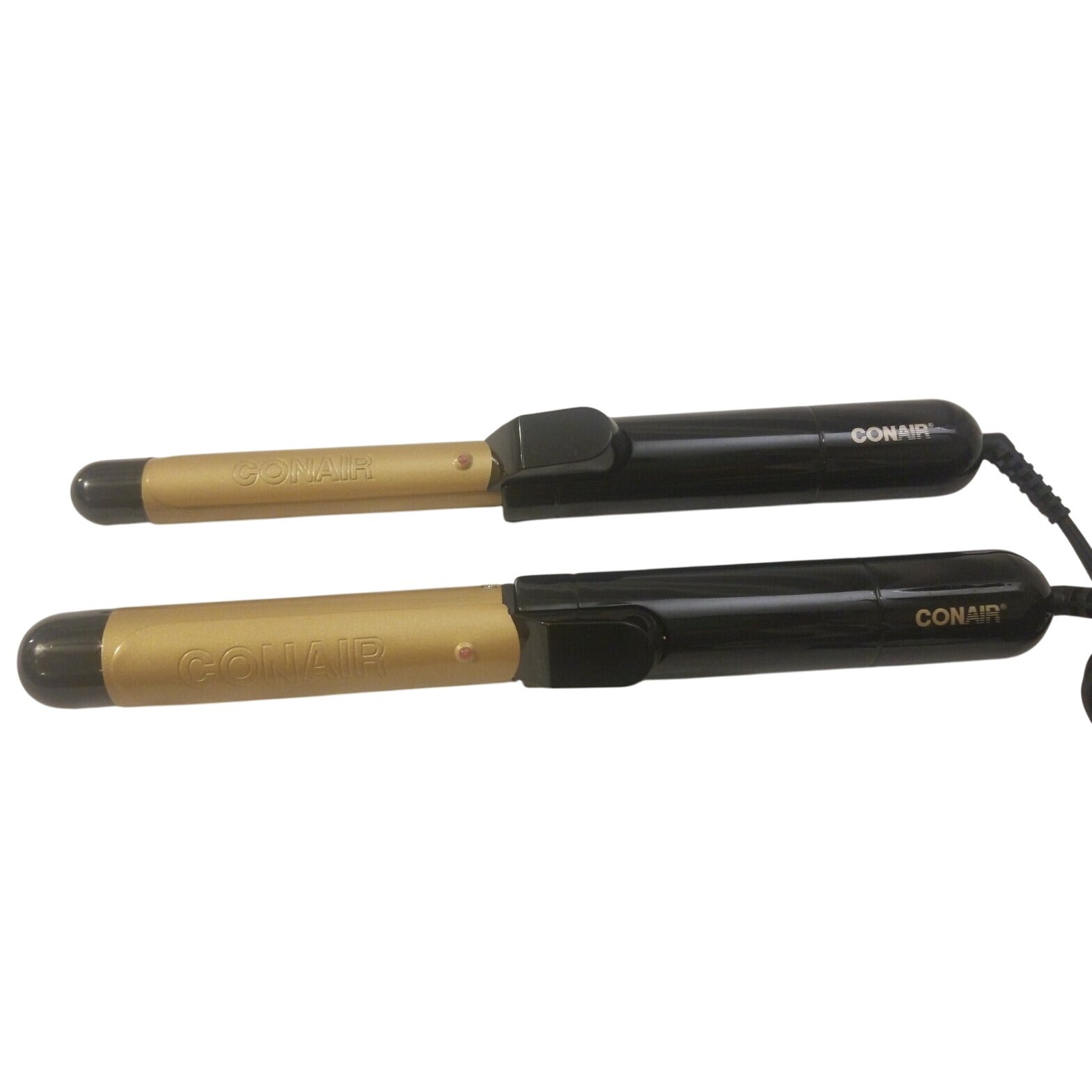 Conair Gold & Black Curling Iron Set 1/2" & 1" Barrels Dual Voltage Swivel Cord, designed for creating defined curls or loose waves. Dual voltage ensures global usability.