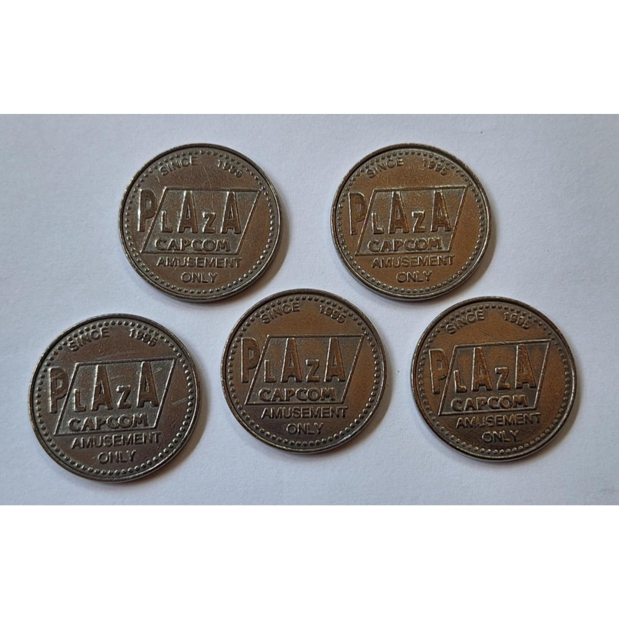 A set of five vintage Capcom arcade tokens featuring unique designs from Plaza amusement centers. Ideal for collectors or enthusiasts of gaming history.