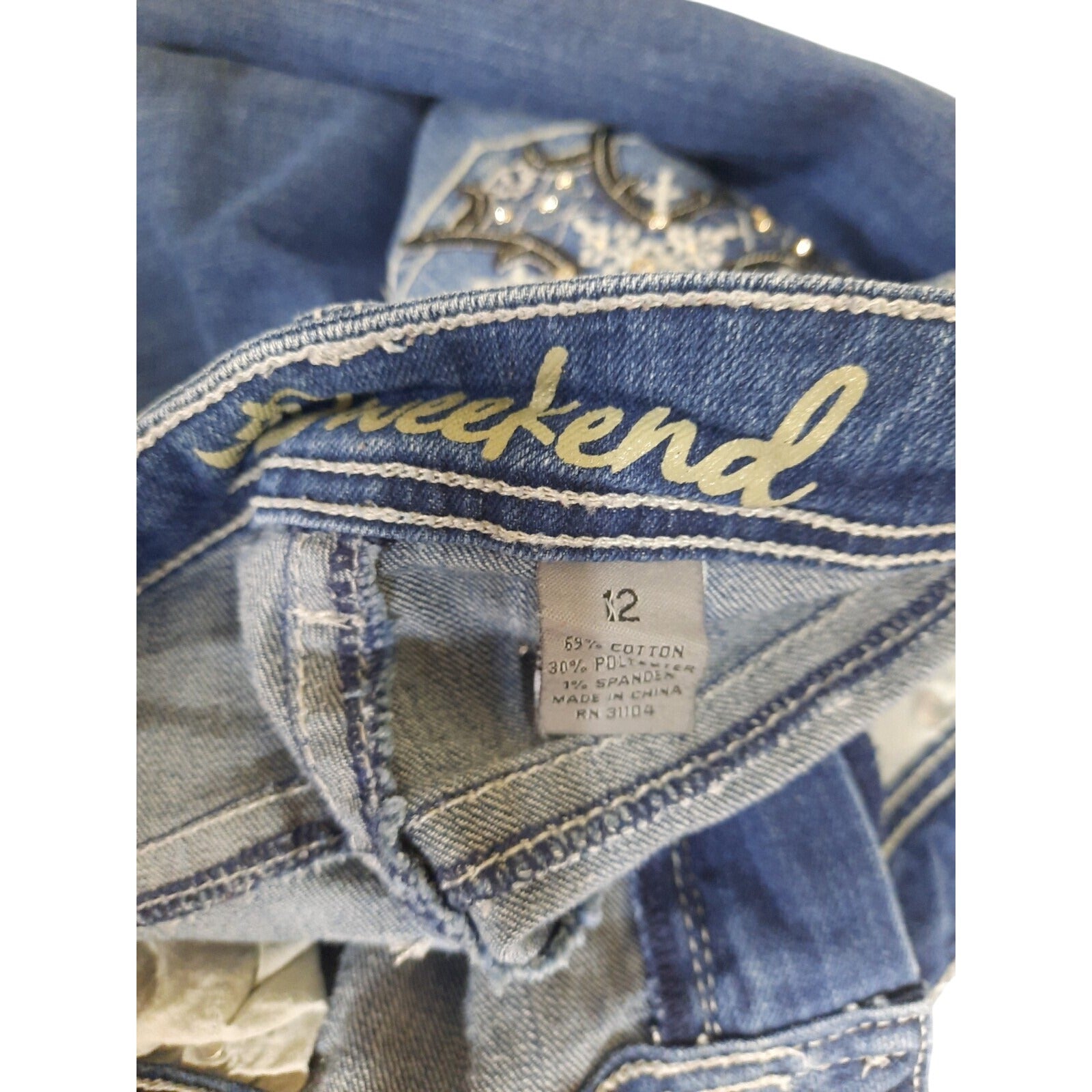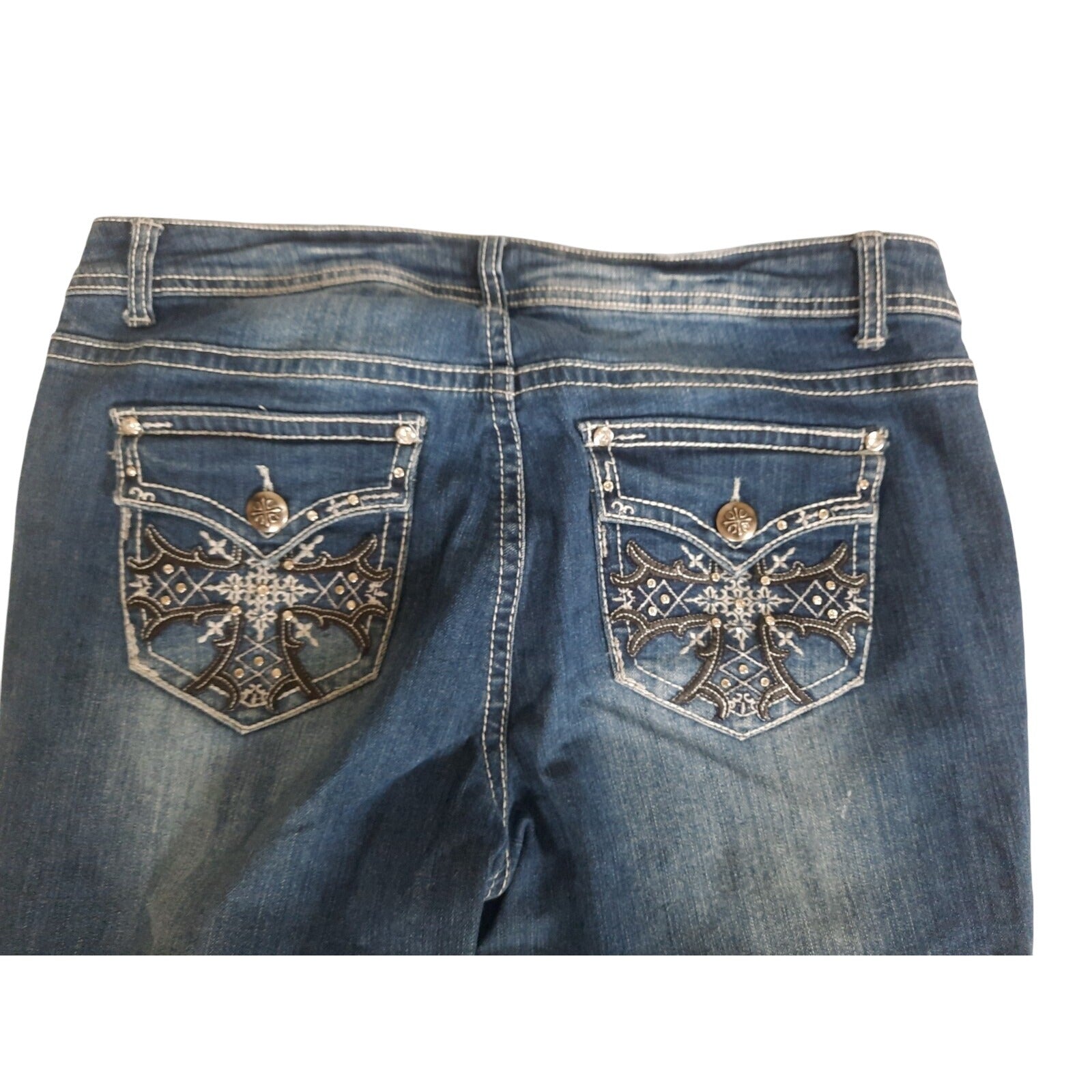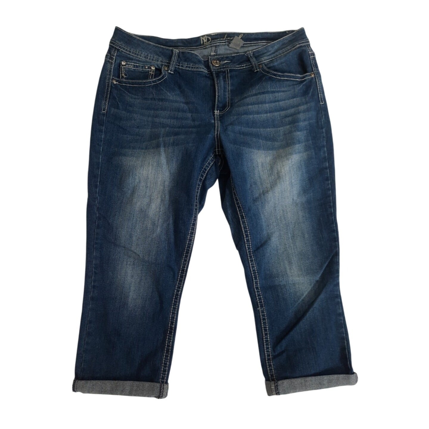 These dark-wash denim capri jeans offer a stylish, comfortable fit with detailed embellishments. Made with a durable cotton/polyester blend and designed with embroidered back pockets for added flair.
