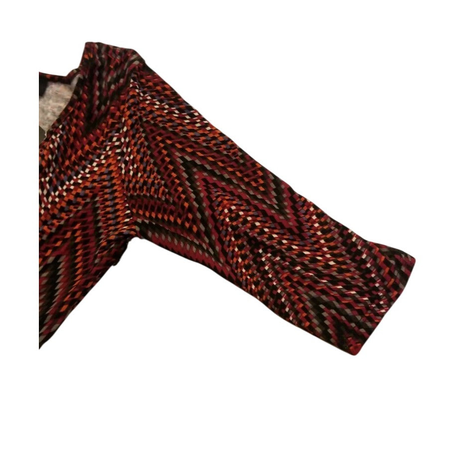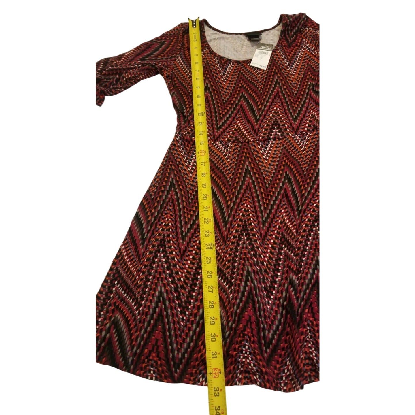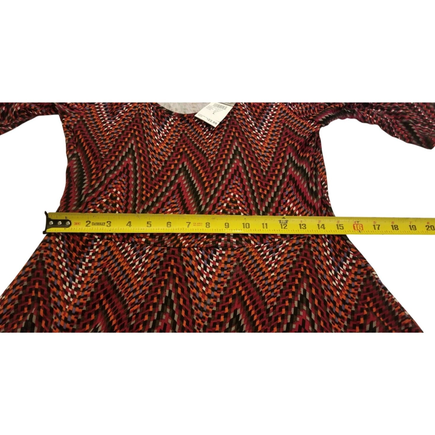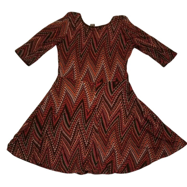 This vibrant fit and flare dress features a chevron pattern in striking red and black hues. Designed with a flattering scoop neck and 3/4 sleeves, it offers both comfort and style.