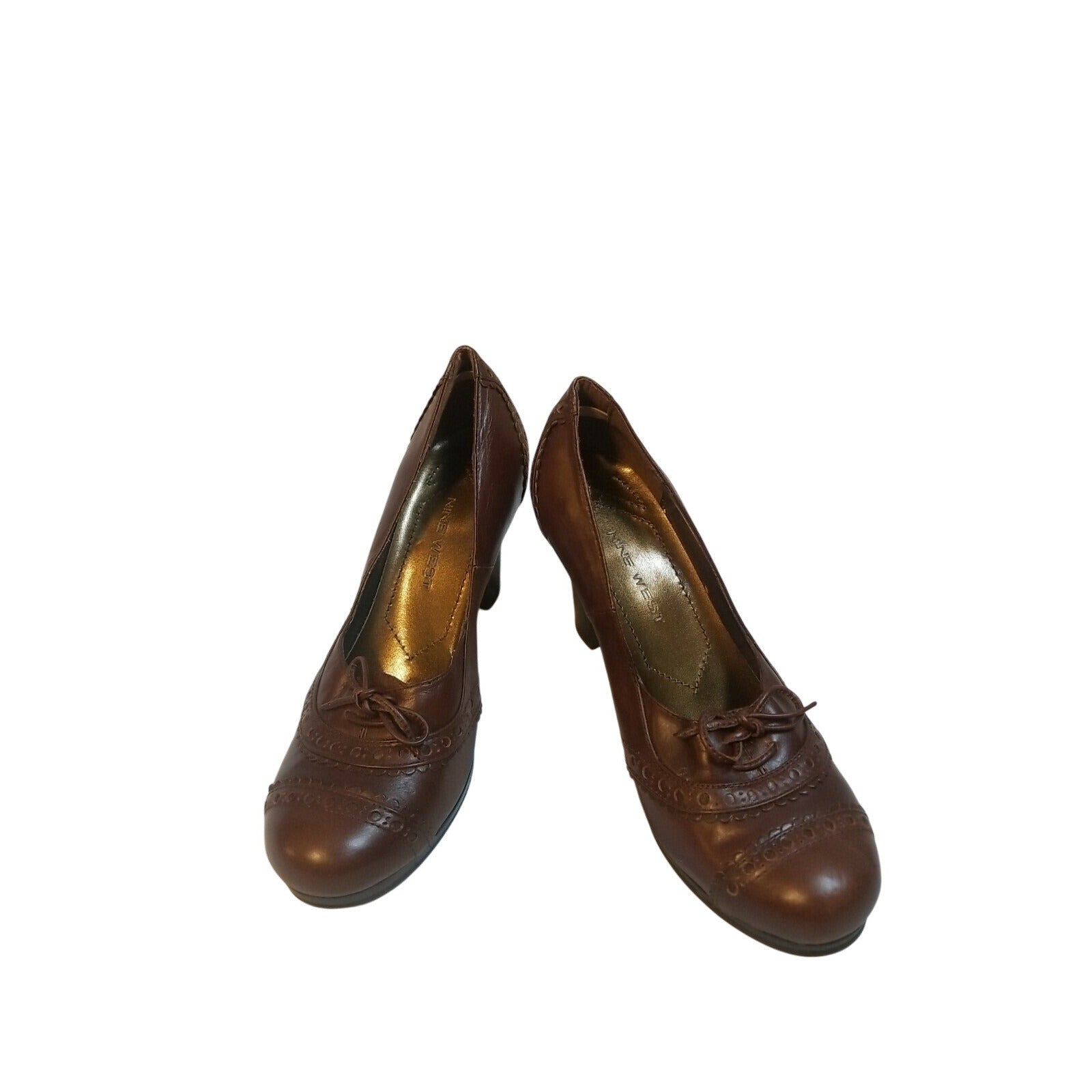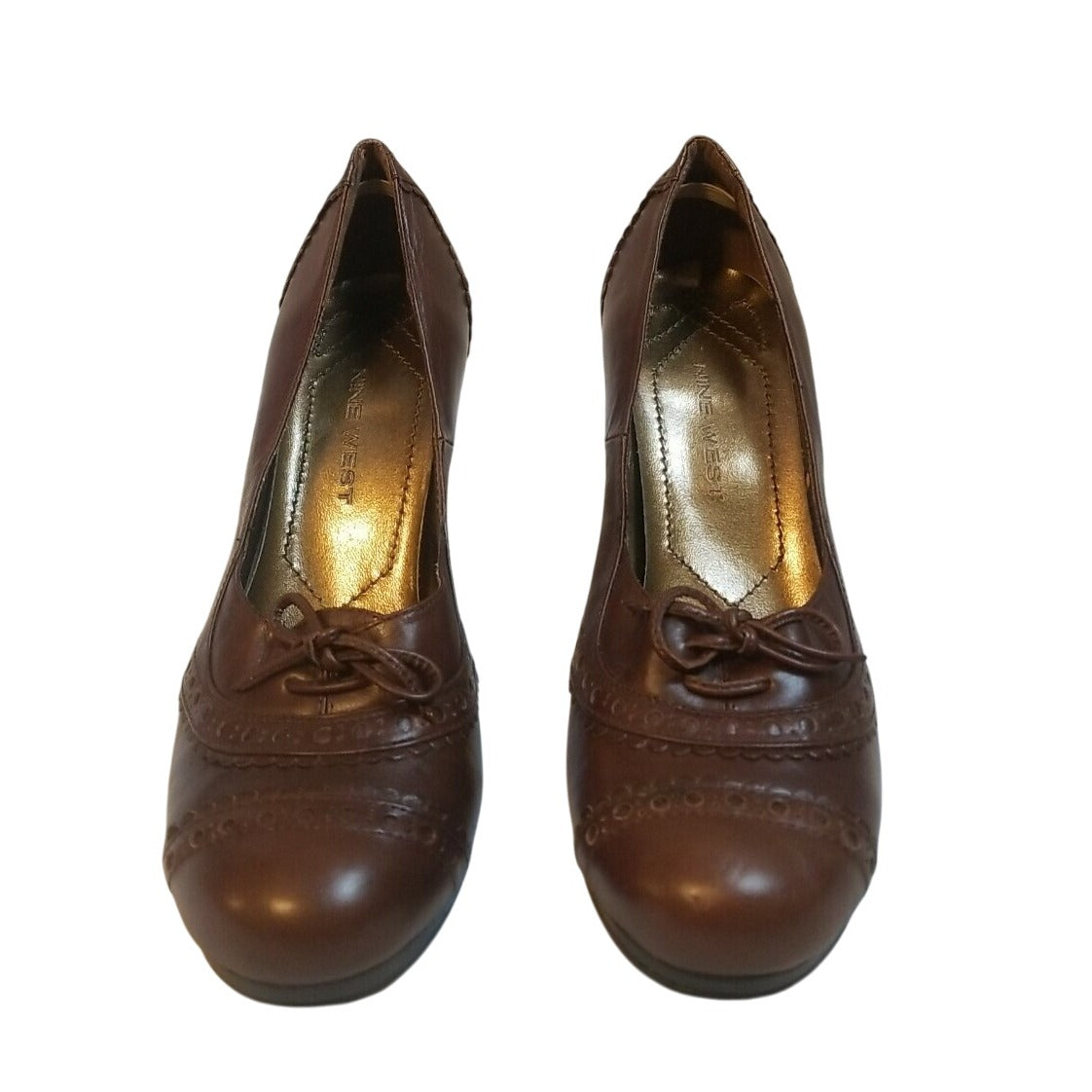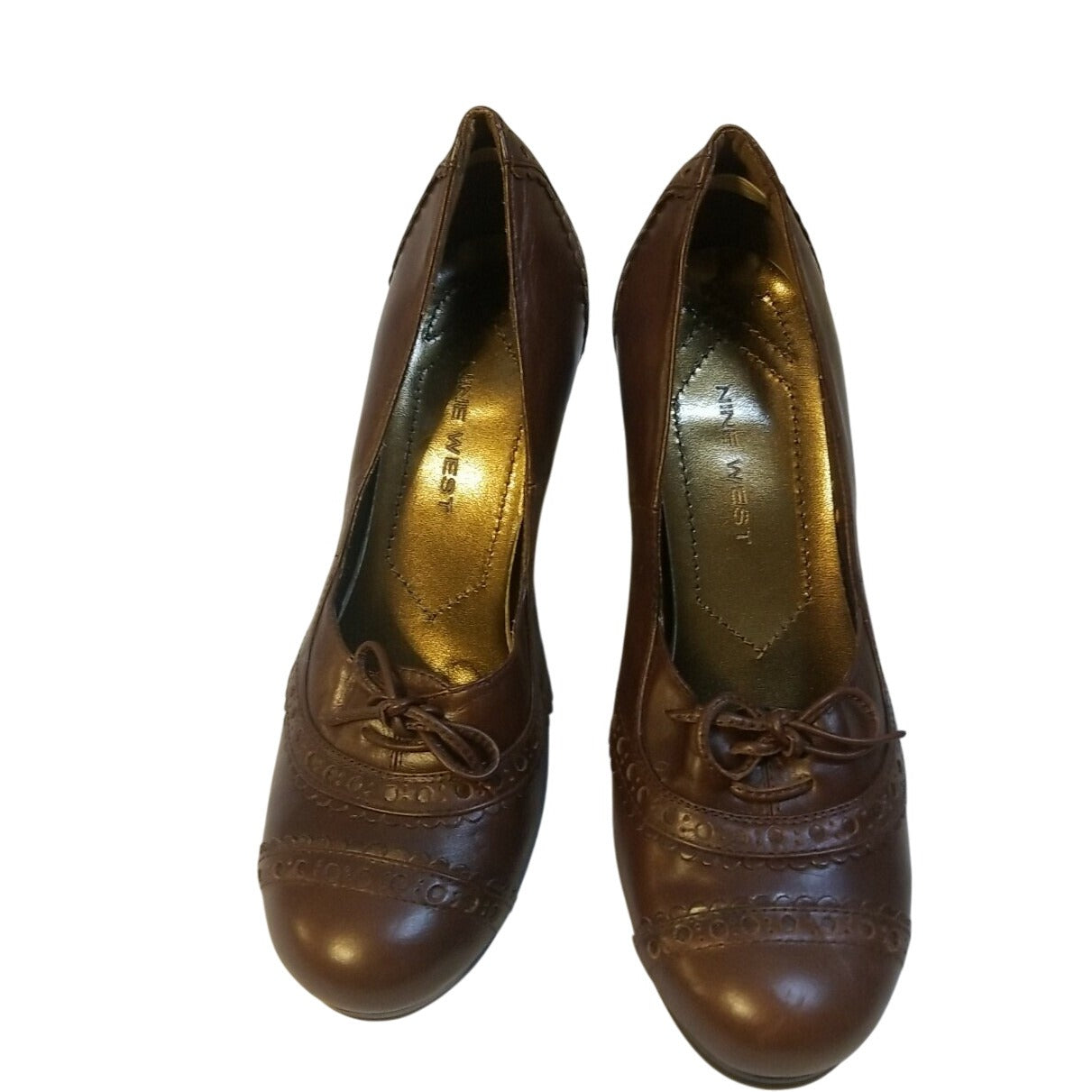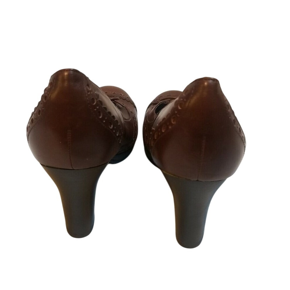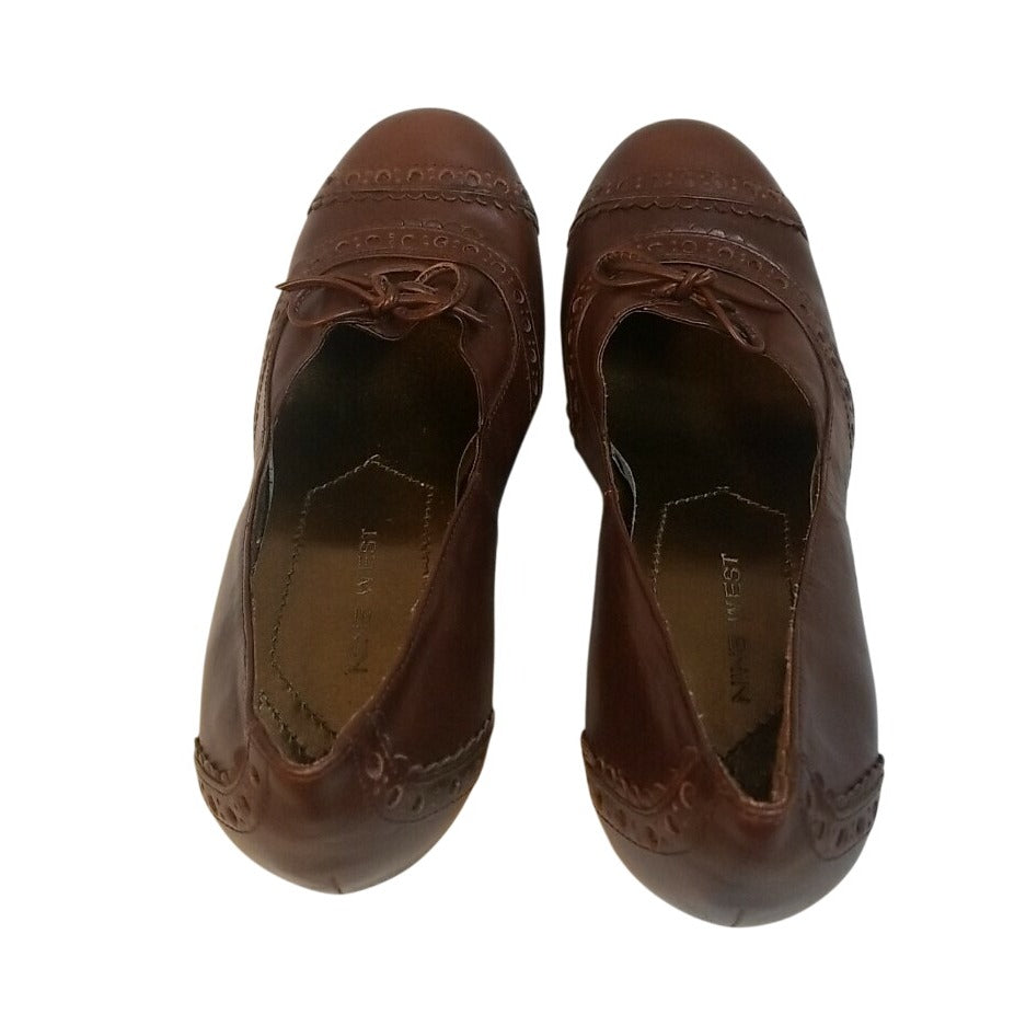 Nine West Brown Leather Heeled Pumps With Decorative Stitching & Lace Detail Size 7.5