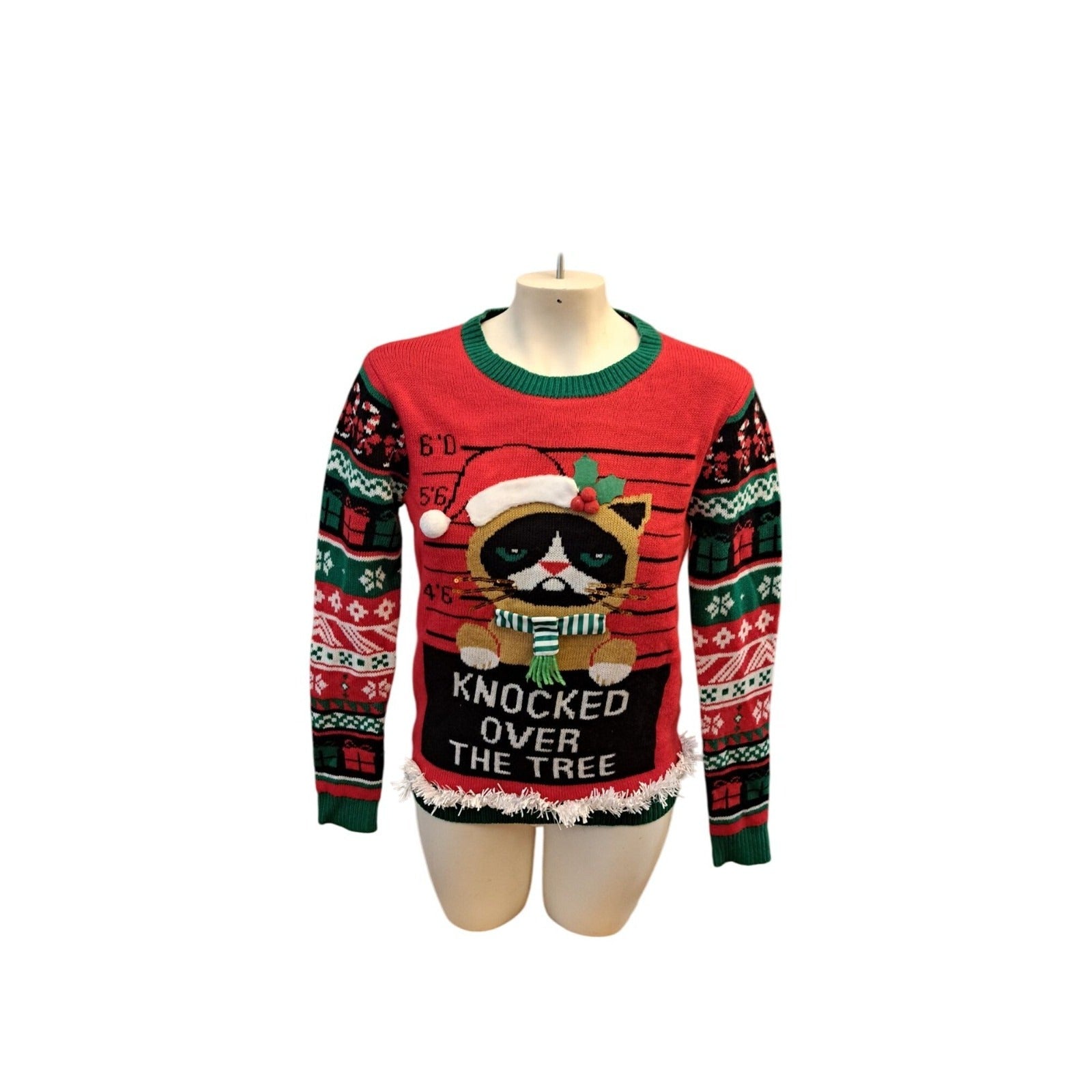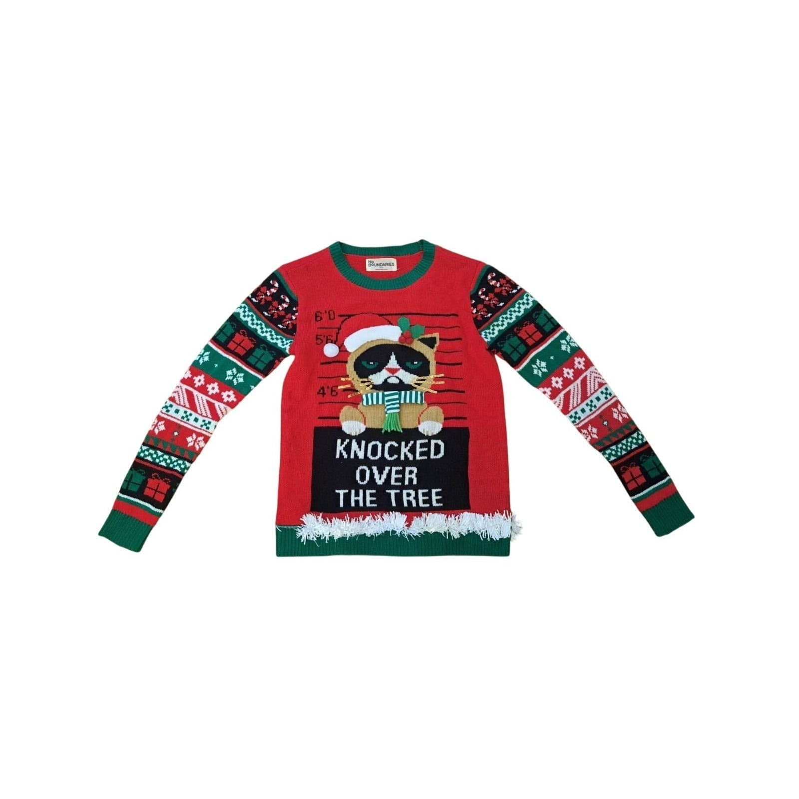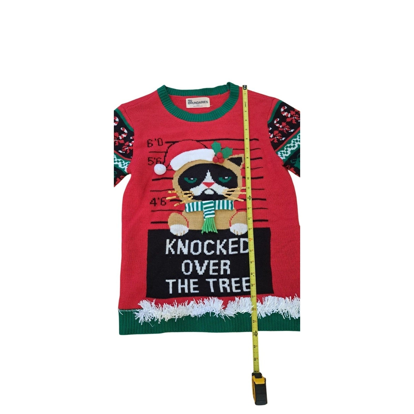 No Boundaries Cat Knocked Over The Tree Ugly Christmas Holiday Sweater Small 4-6This sweater features a humorous "Knocked Over The Tree" design with a festive cat graphic. Its vibrant colors and unique pattern make it a standout choice for holiday gatherings.