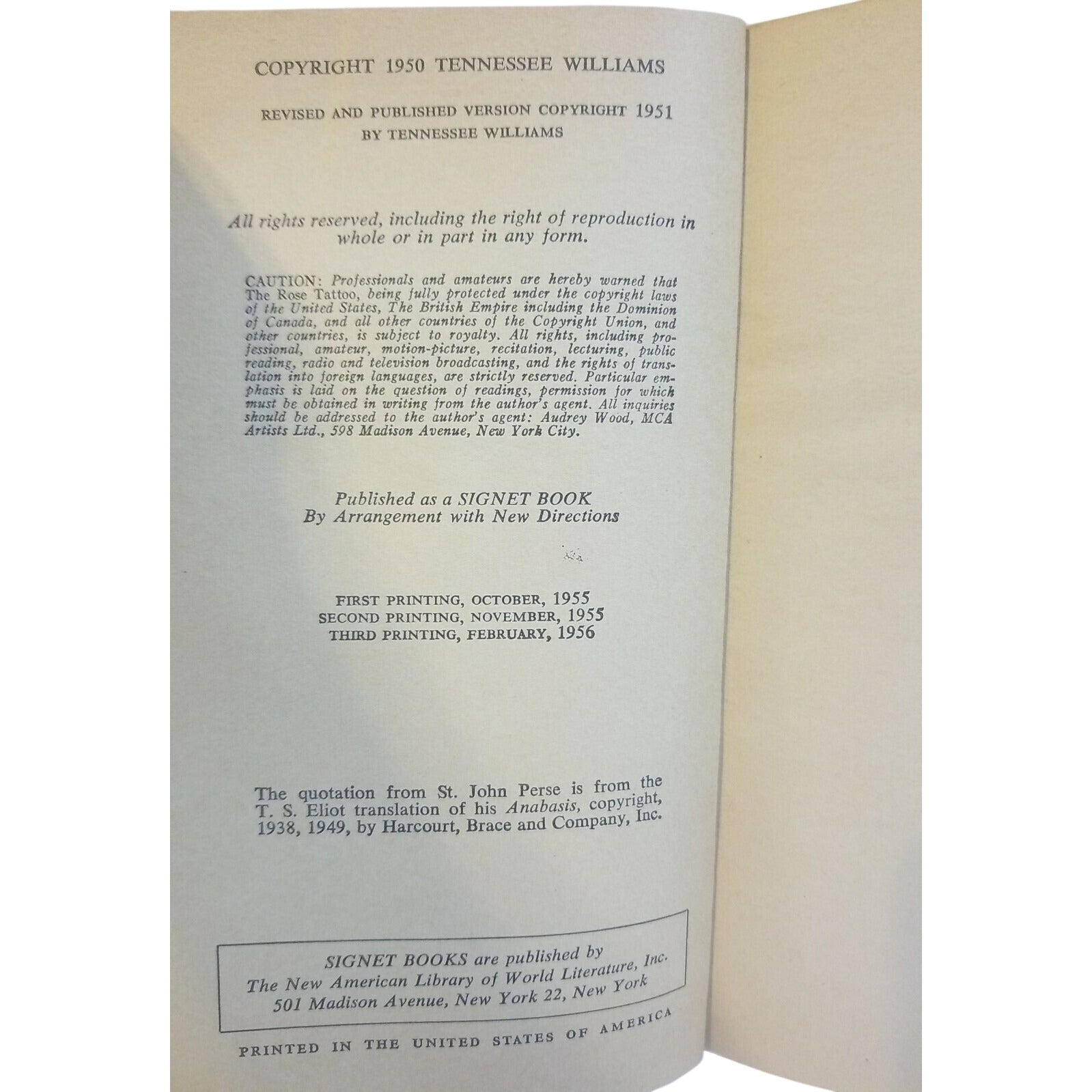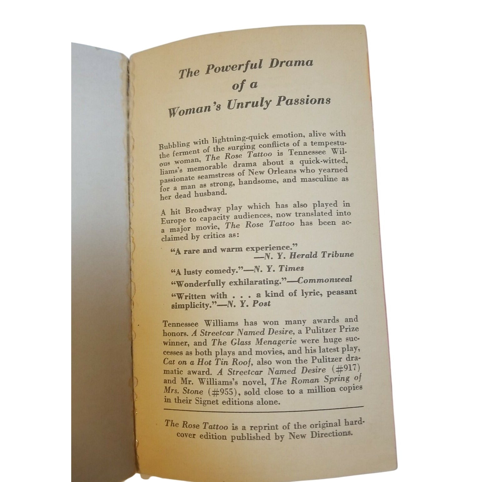 A collection of three literary works by Tennessee Williams, offering insight into his plays, interviews, and creative vision. Ideal for enthusiasts or collectors.