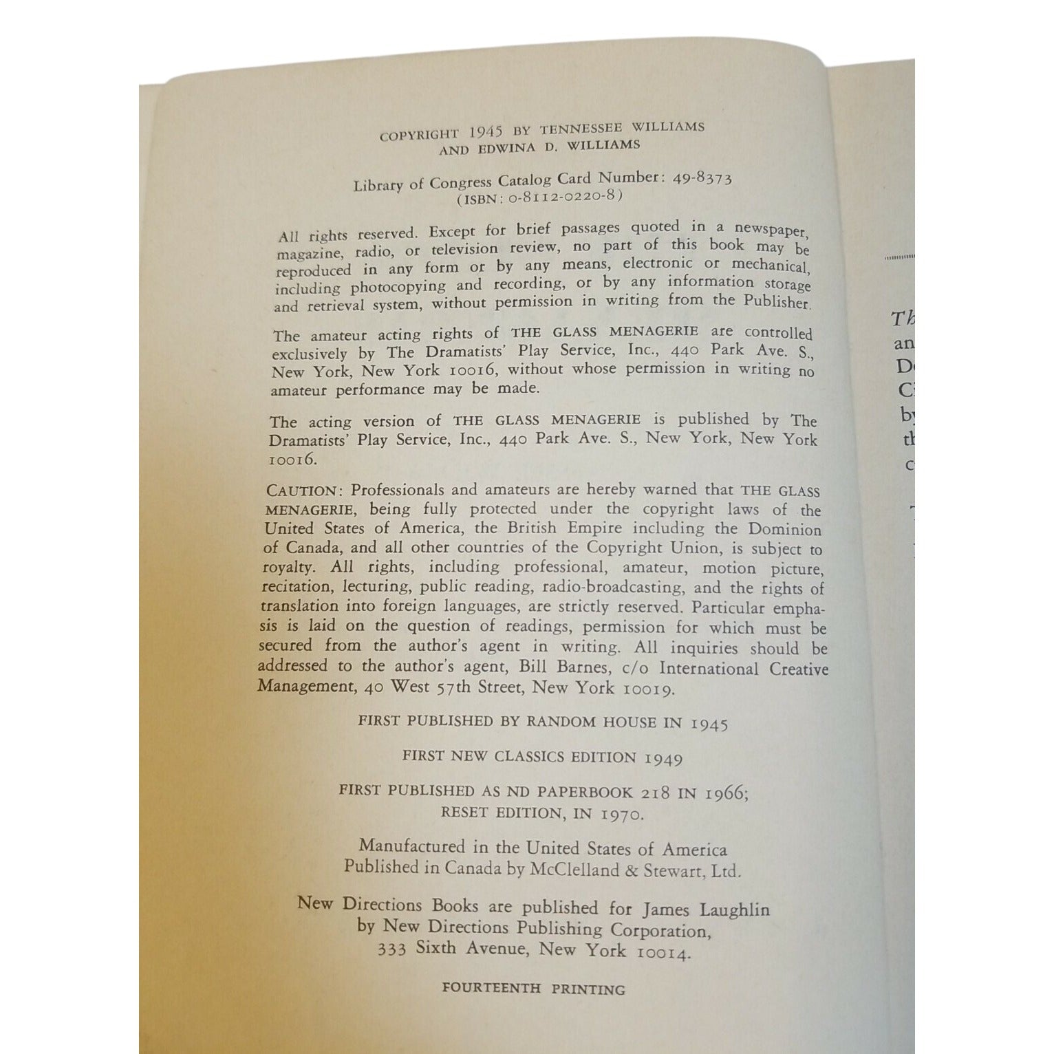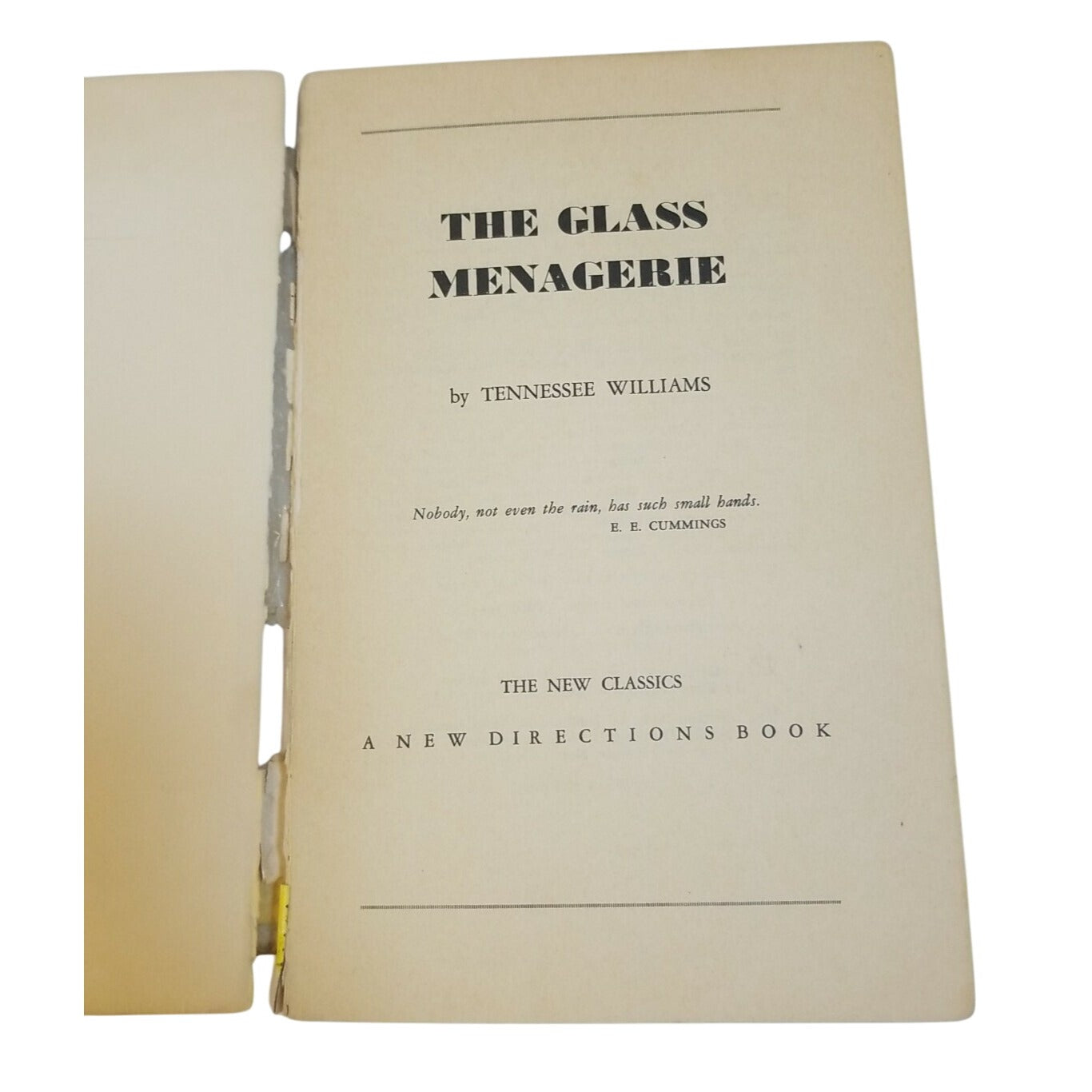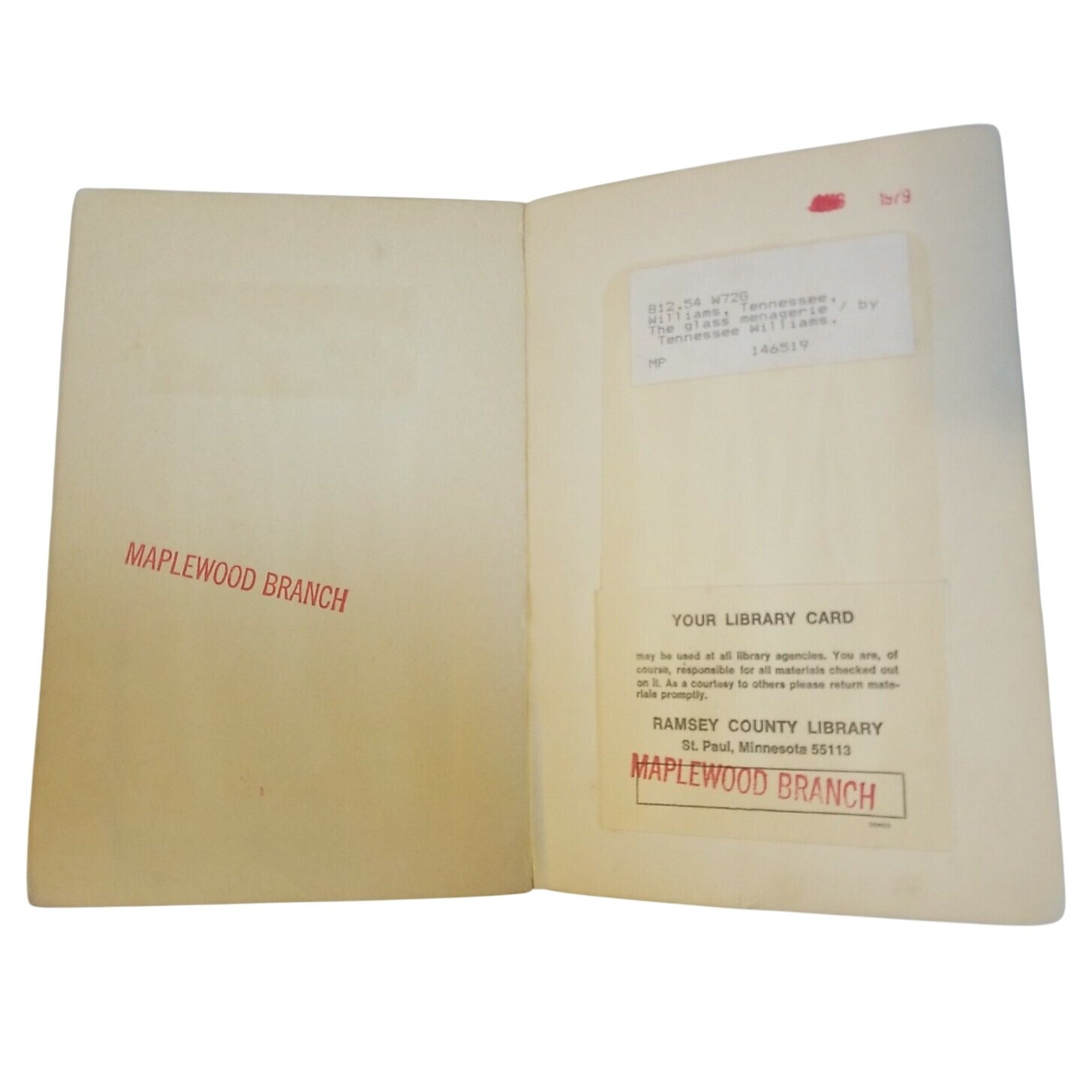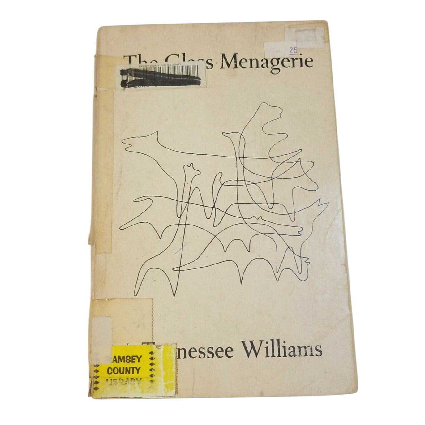 "The Glass Menagerie" cover shows wear with library markings and tape residue. Page edges are intact.