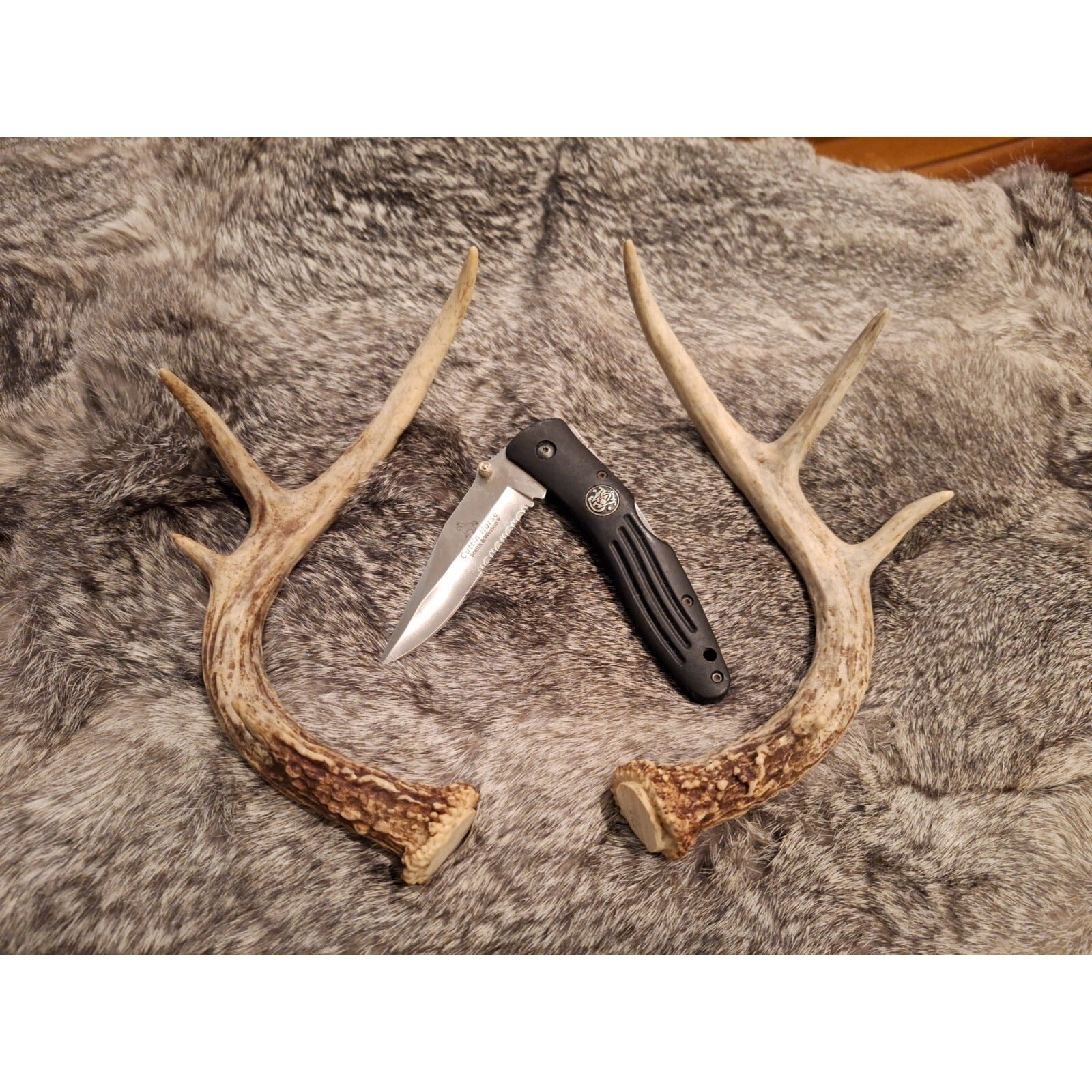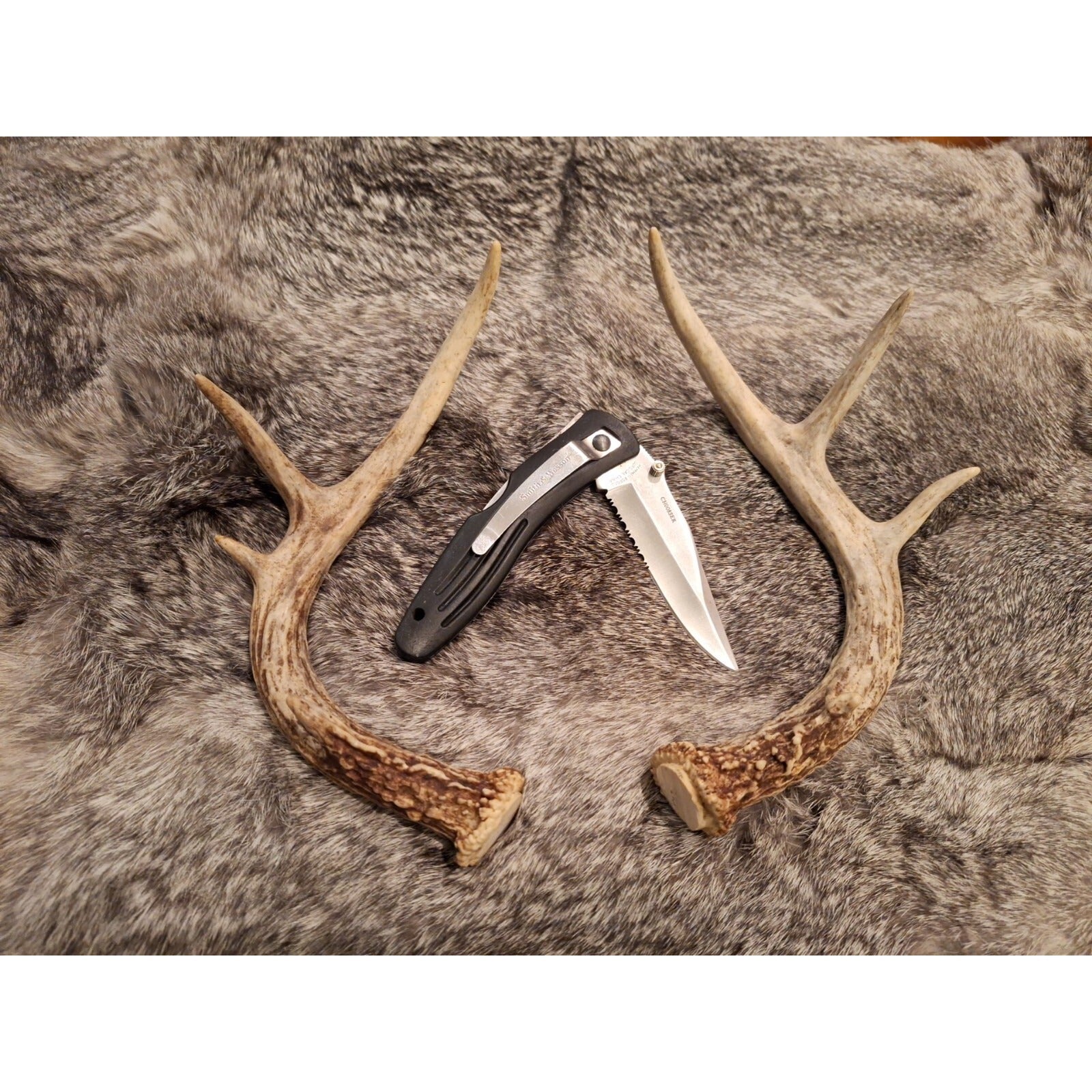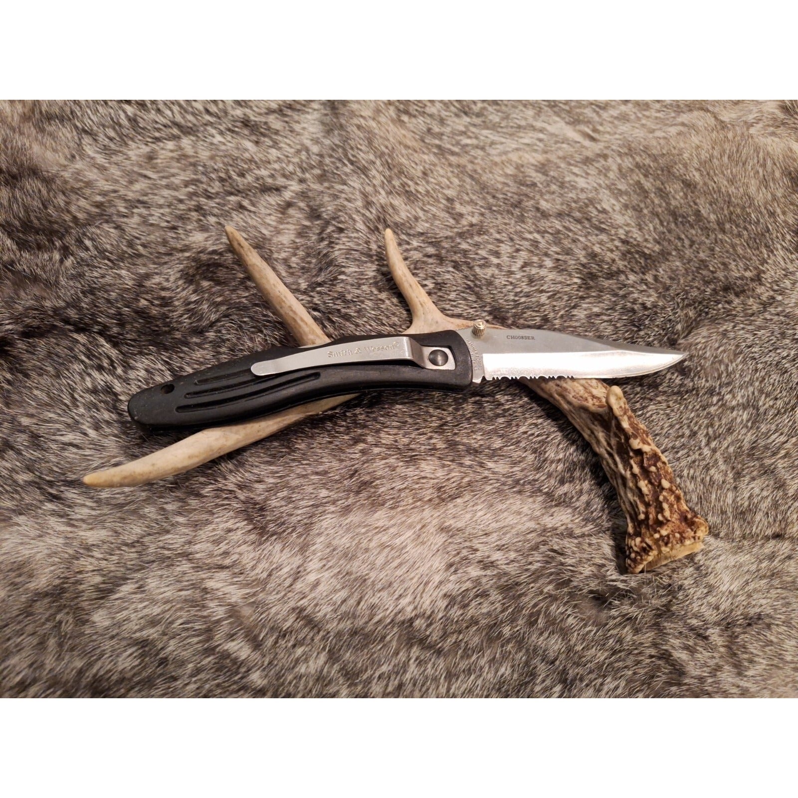 This folding pocket knife features a durable stainless steel blade and a sturdy black handle, designed for reliable performance in outdoor and hunting applications.