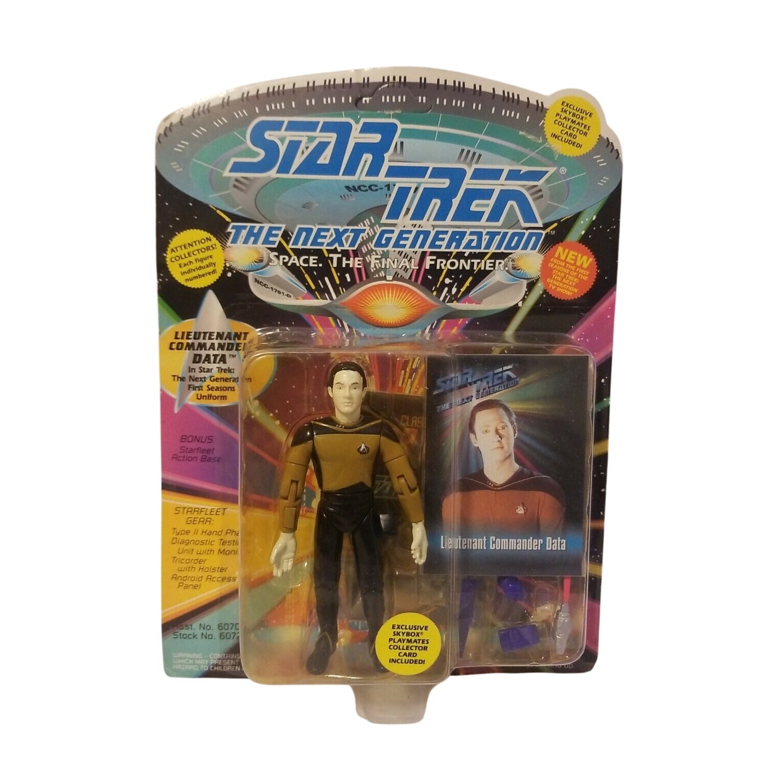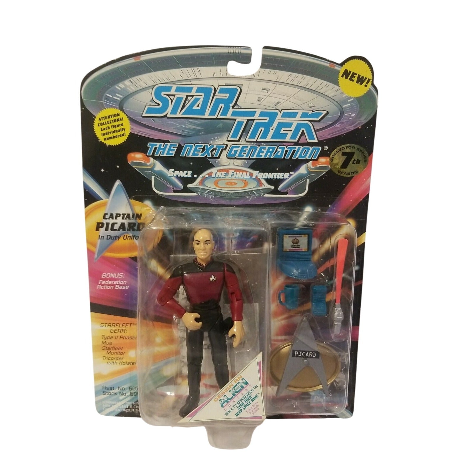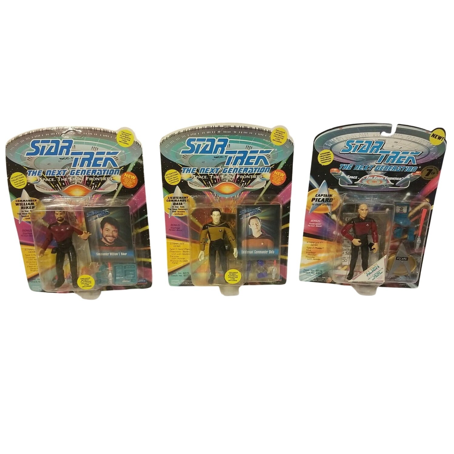 These collectible action figures represent iconic characters from Star Trek: The Next Generation, featuring Captain Picard, Commander Riker, and Lieutenant Commander Data. Each figure includes detailed Starfleet accessories and remains sealed in original packaging, making them ideal for collectors and fans.