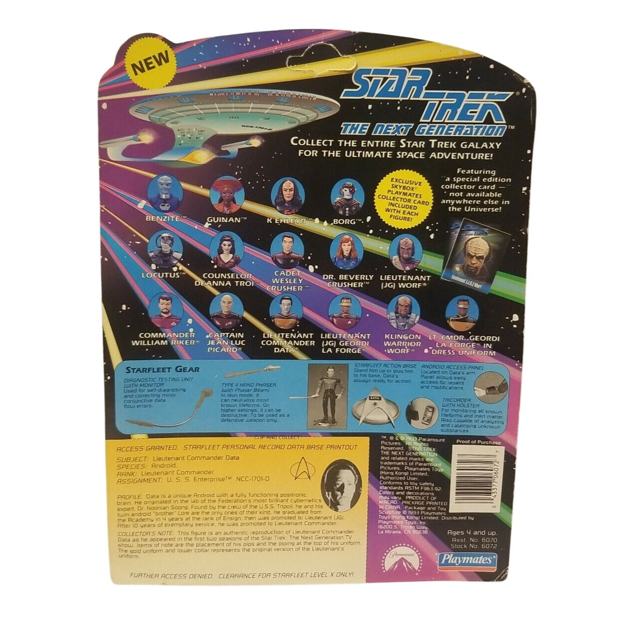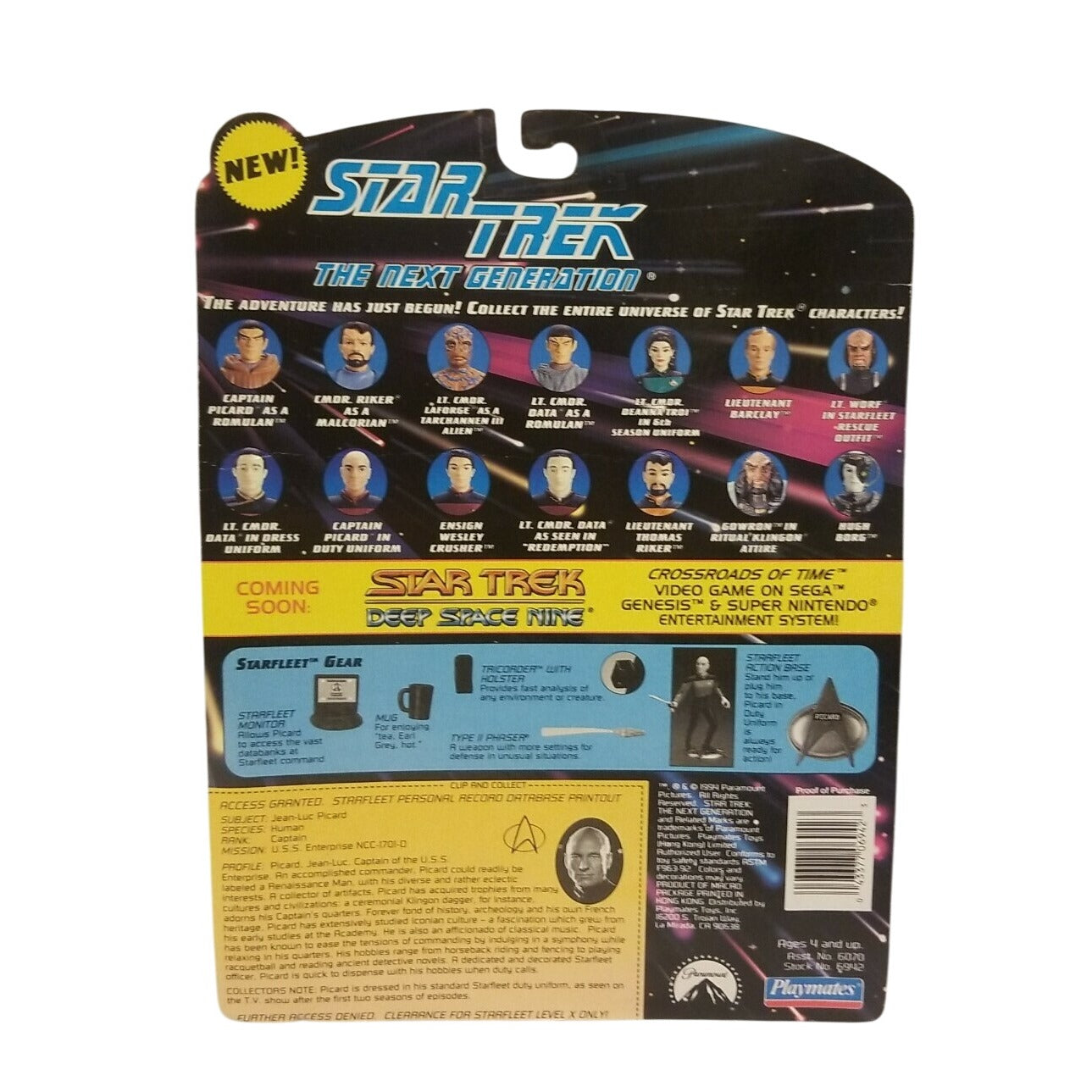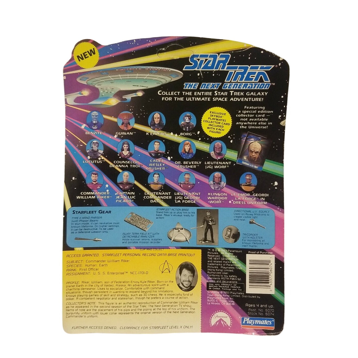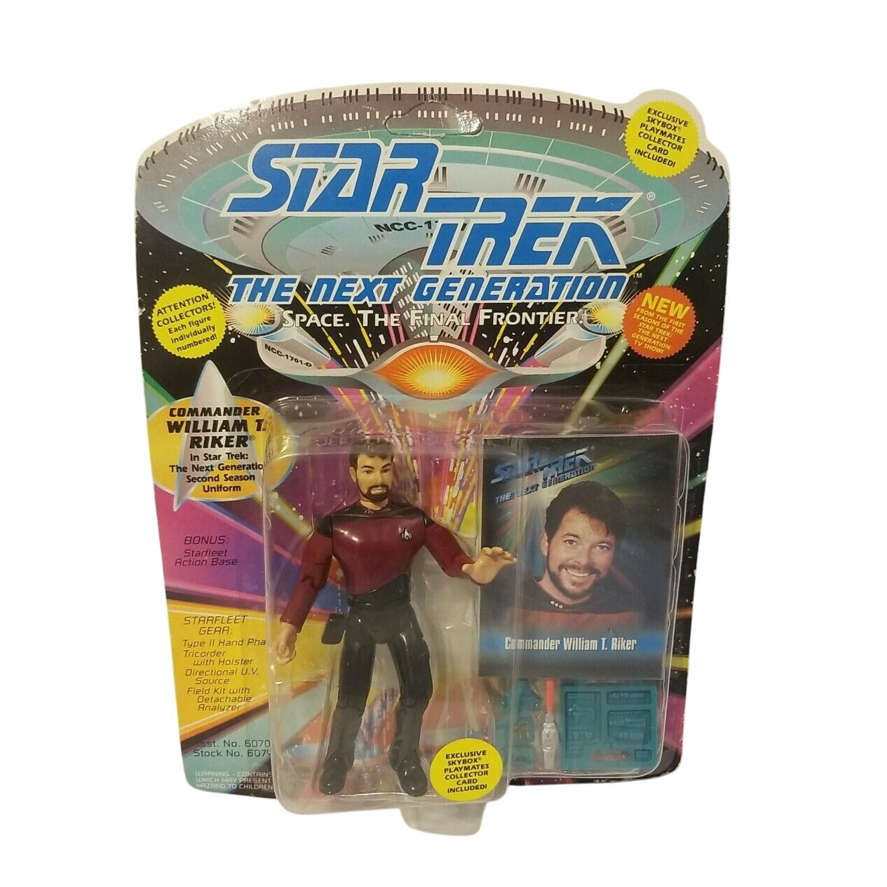 These collectible action figures represent iconic characters from Star Trek: The Next Generation, featuring Captain Picard, Commander Riker, and Lieutenant Commander Data. Each figure includes detailed Starfleet accessories and remains sealed in original packaging, making them ideal for collectors and fans.