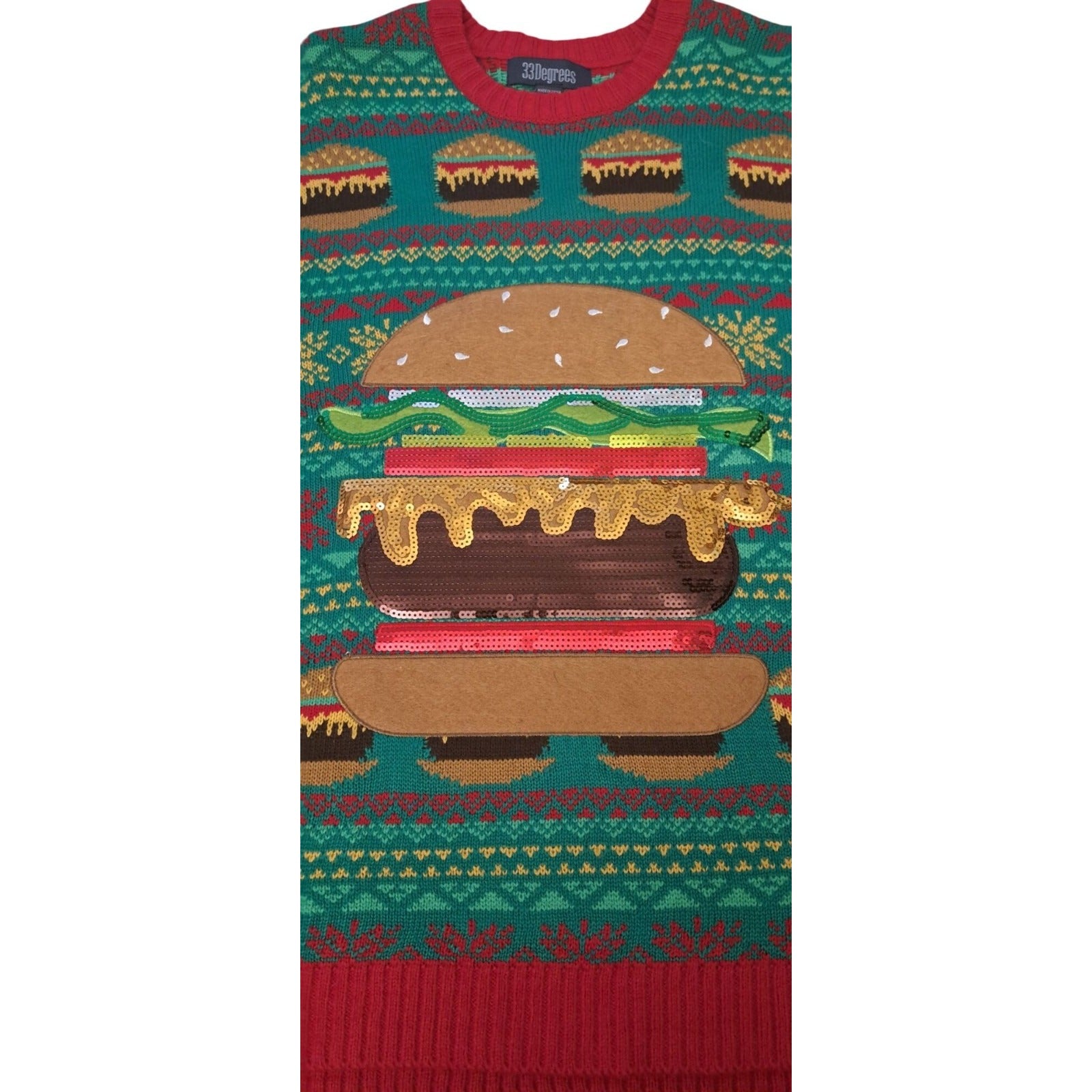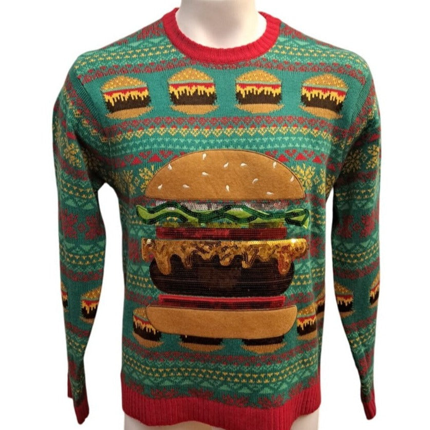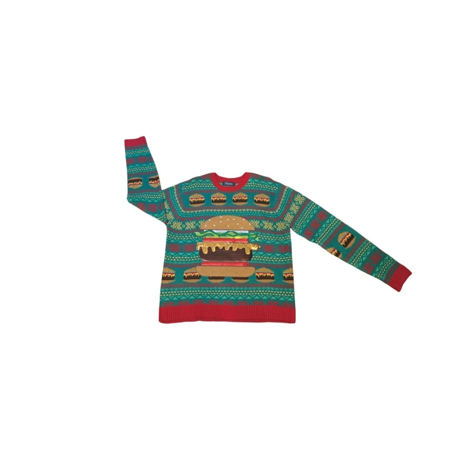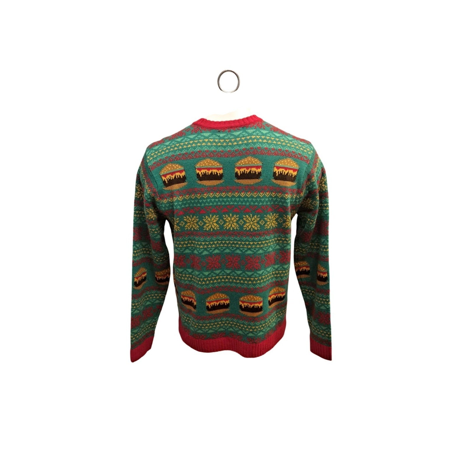 This festive burger-themed holiday sweater is the perfect blend of cozy comfort and playful style. Featuring a bold 3D burger graphic on the front and matching mini-burger designs across the chest, sleeves, and back, it’s sure to stand out at any holiday gathering.