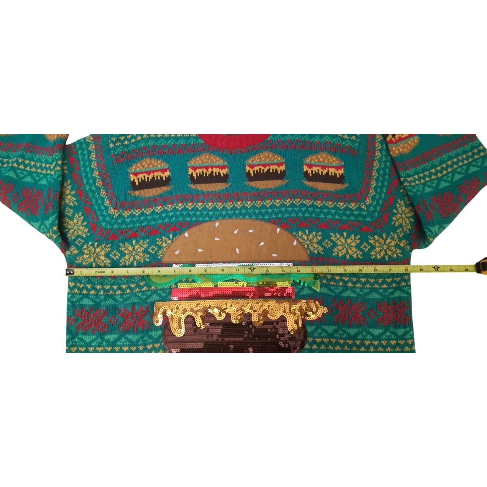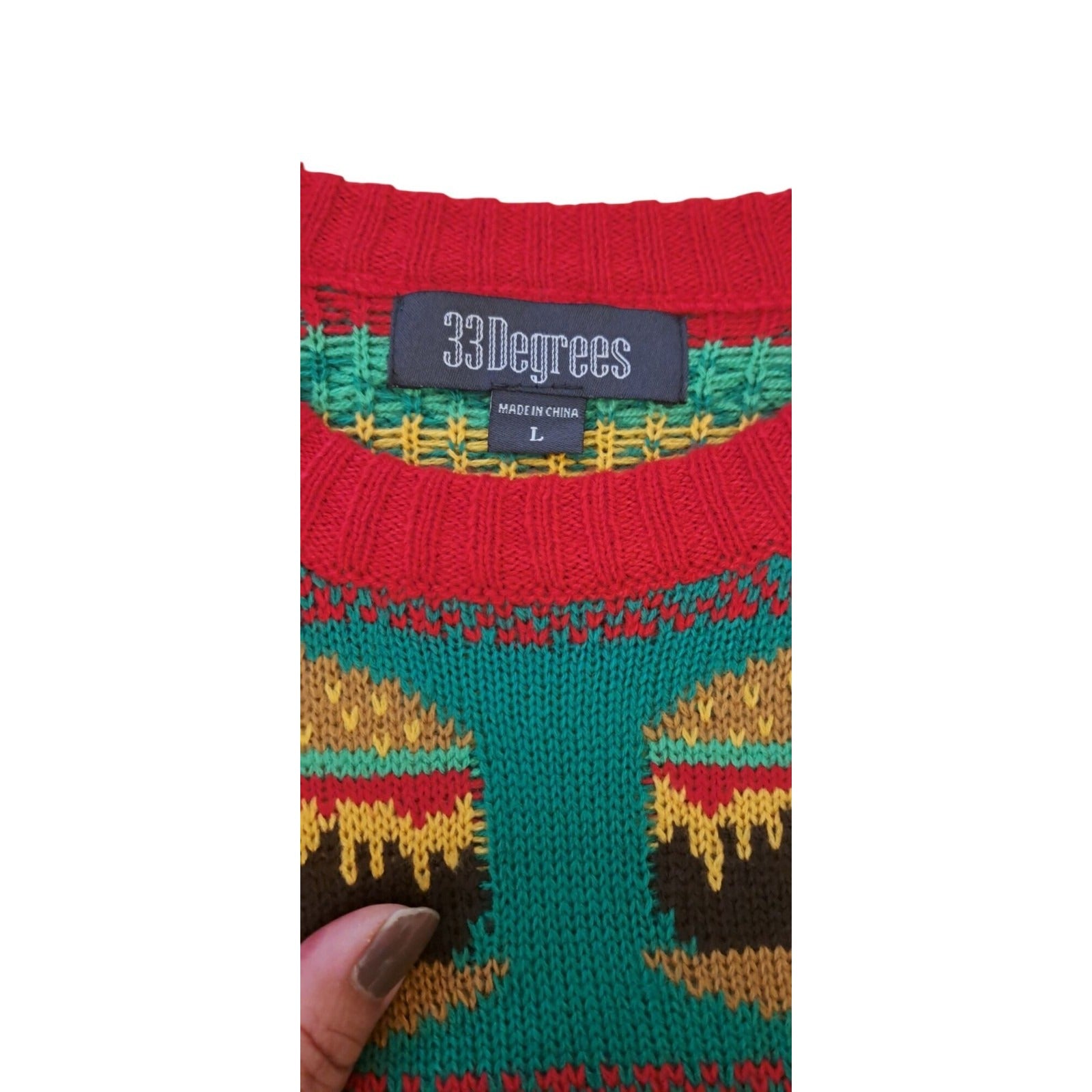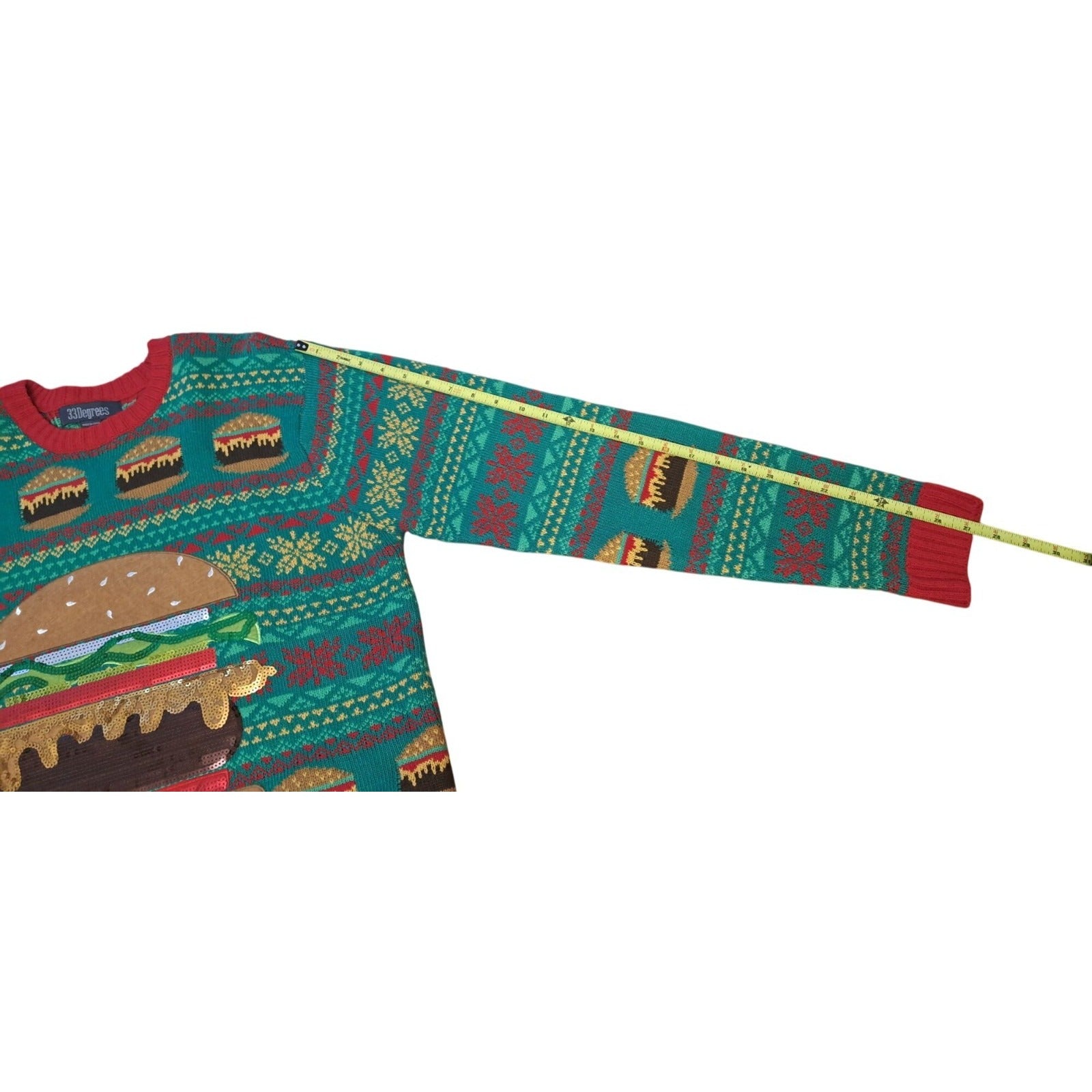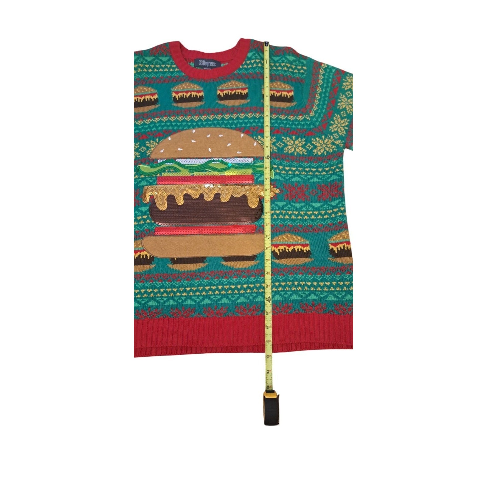 This festive burger-themed holiday sweater is the perfect blend of cozy comfort and playful style. Featuring a bold 3D burger graphic on the front and matching mini-burger designs across the chest, sleeves, and back, it’s sure to stand out at any holiday gathering.
