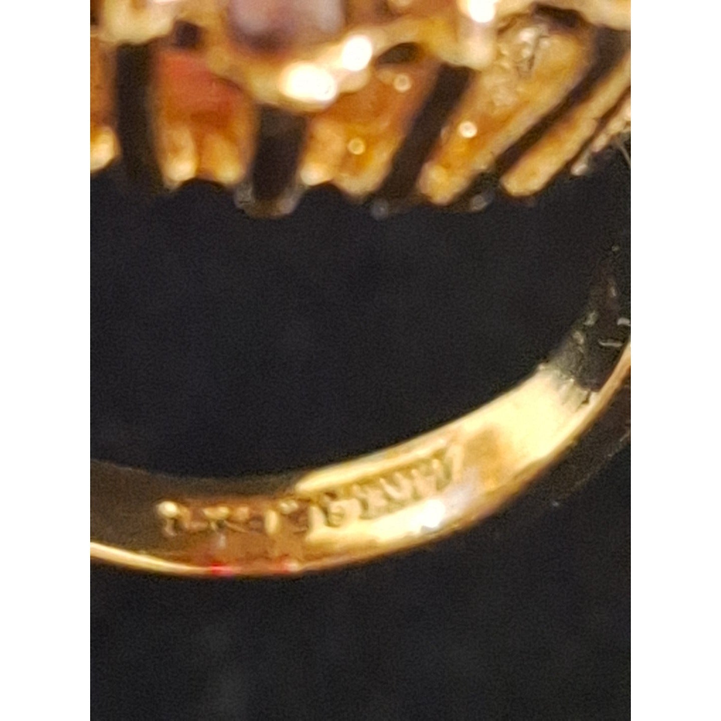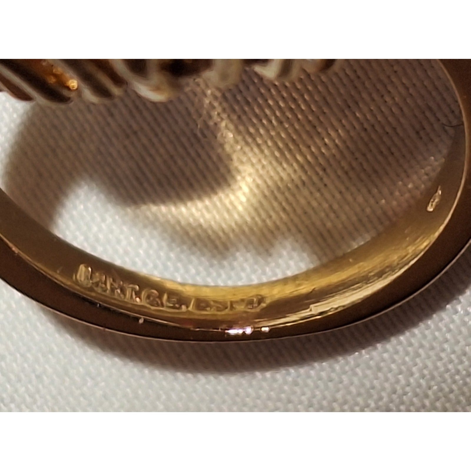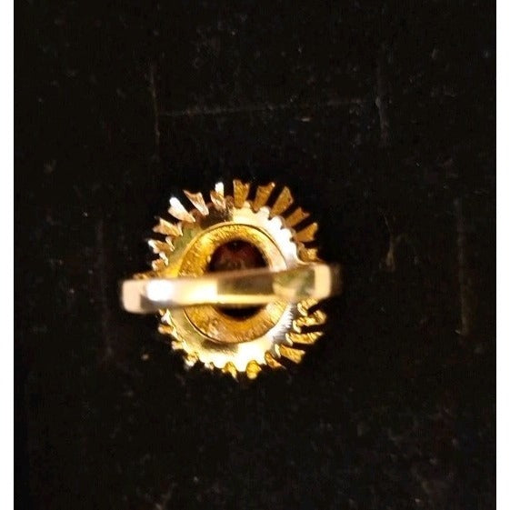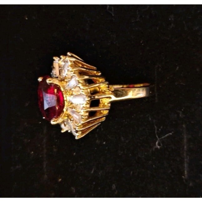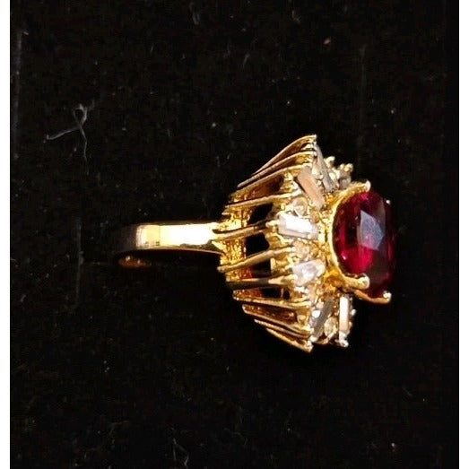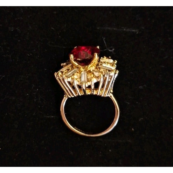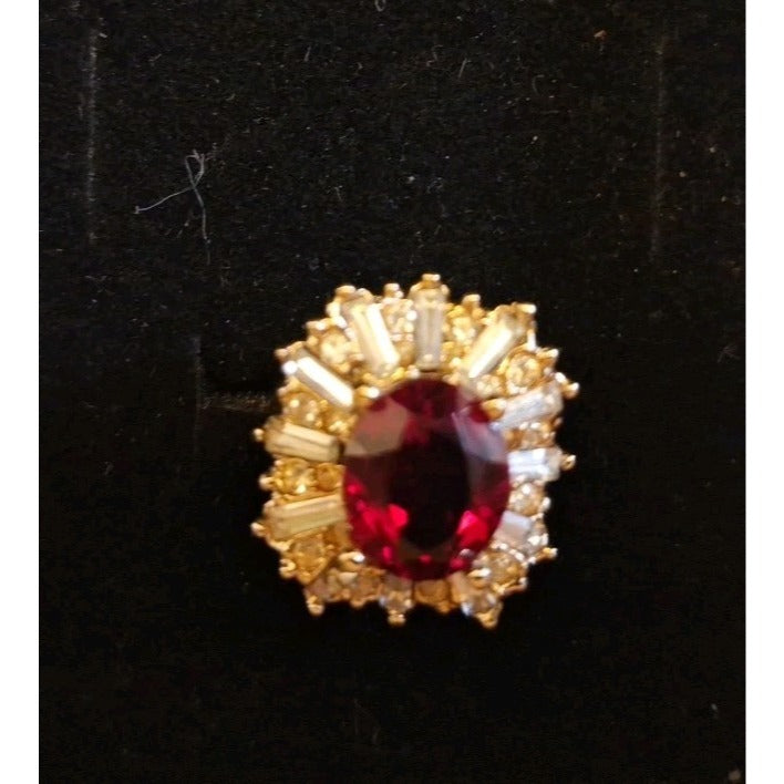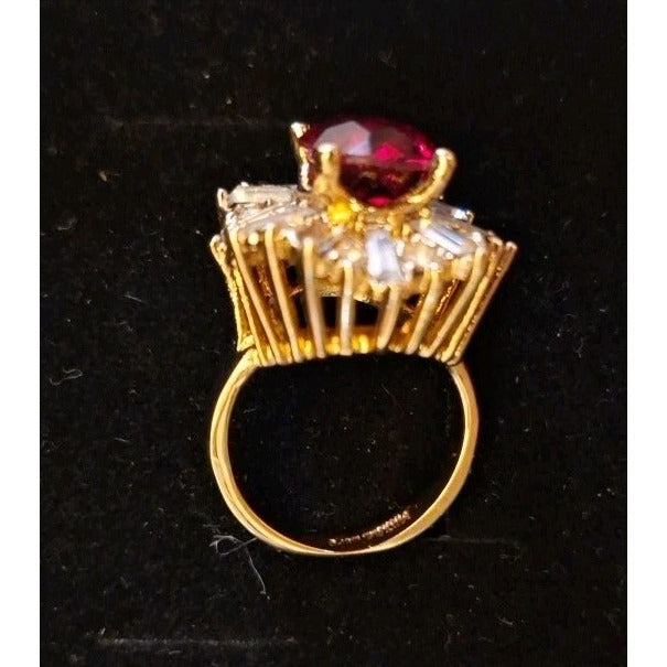 This vintage ESPO ruby-style cocktail ring features a deep red oval stone surrounded by a sparkling halo of clear rhinestones. Crafted in gold-tone metal, it has a raised setting and classic band design that adds elegance and height to the piece. A timeless statement ring ideal for collectors or special-occasion wear. Size approximately 7.