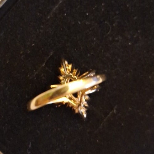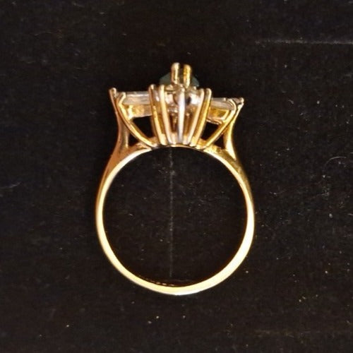 This vintage SK marquise blue cocktail ring features an icy blue marquise-cut crystal accented by clear baguette and round stones. The raised crown setting adds height and elegance, paired with a classic gold-tone band. A bold and glamorous statement piece ideal for vintage jewelry lovers. Pre-owned and well-kept with stones intact. Item: Vintage SK Marquise Blue Cocktail Ring Material: Gold-tone metal Stone: Light-blue marquise crystal with clear baguette & round accents Style: Halo / statement cocktail ring Brand / Marking: SK Band Style: Raised crown setting with classic band Condition: Great vintage condition; stones intact Size: Approx. 8.5 Color: Gold tone with icy blue & clear stones