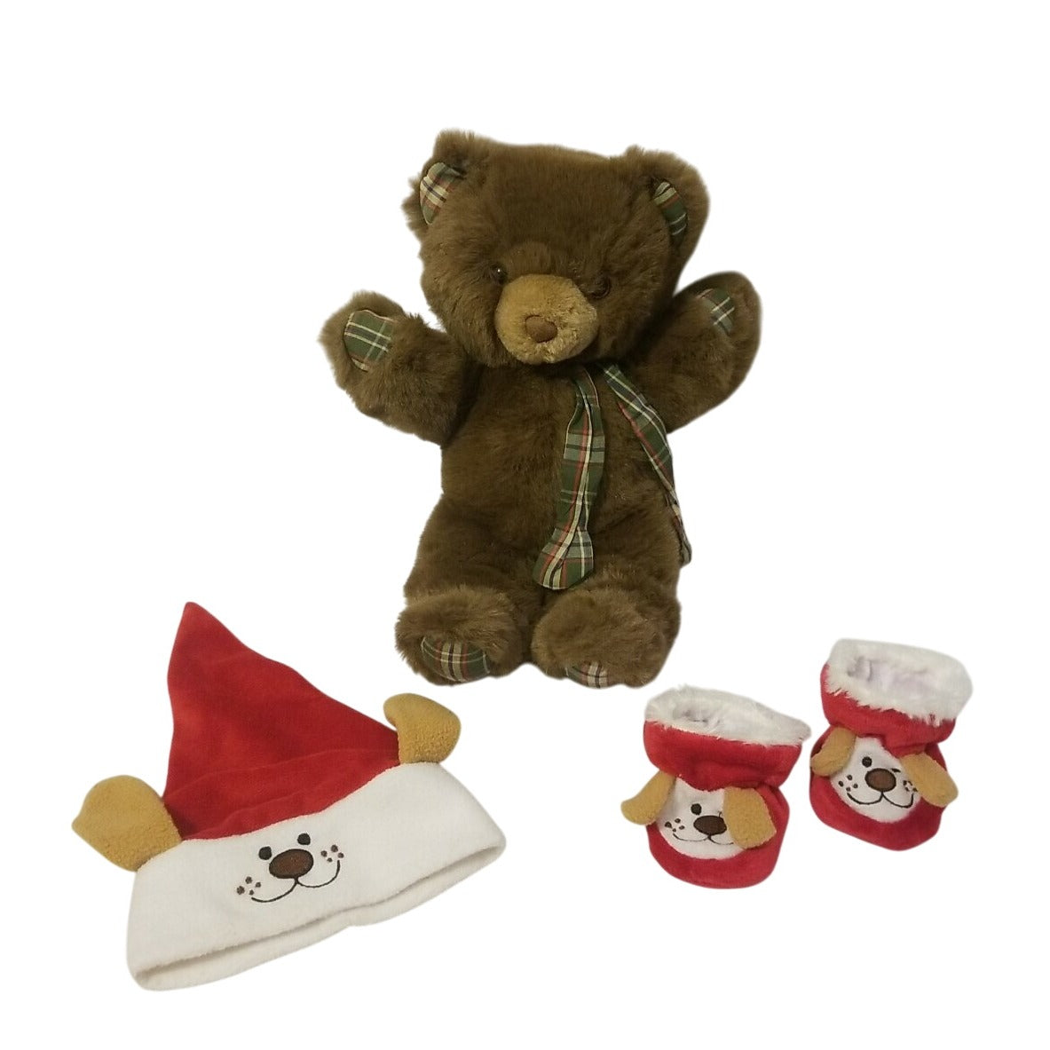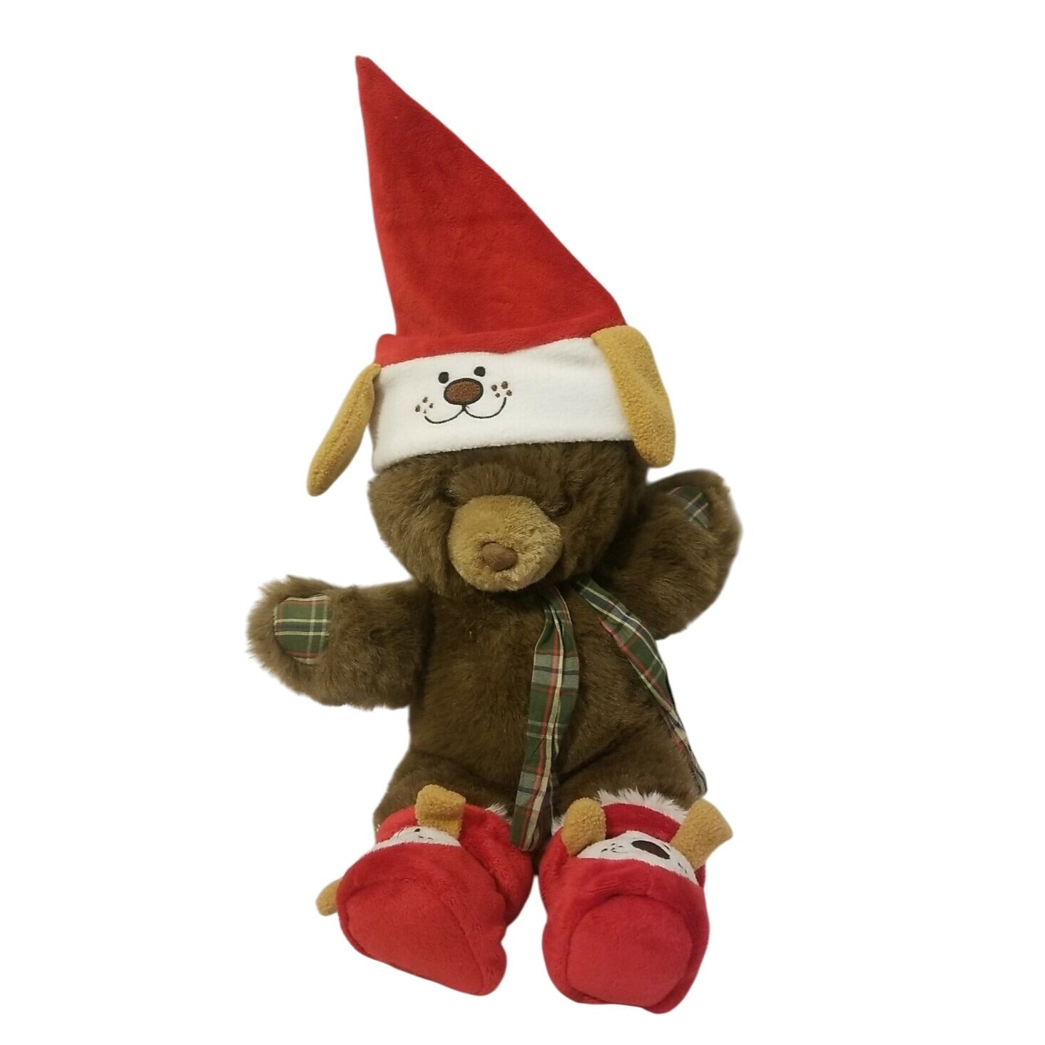 An adorable collectible teddy bear dressed for the holiday season, featuring a removable dog-themed hat and booties. Ideal for festive displays or gifting.