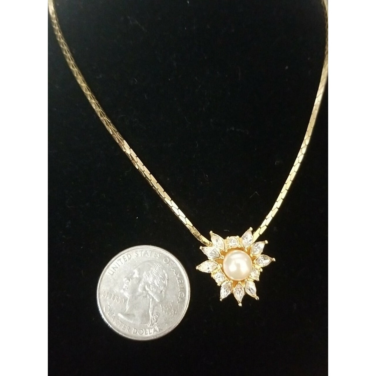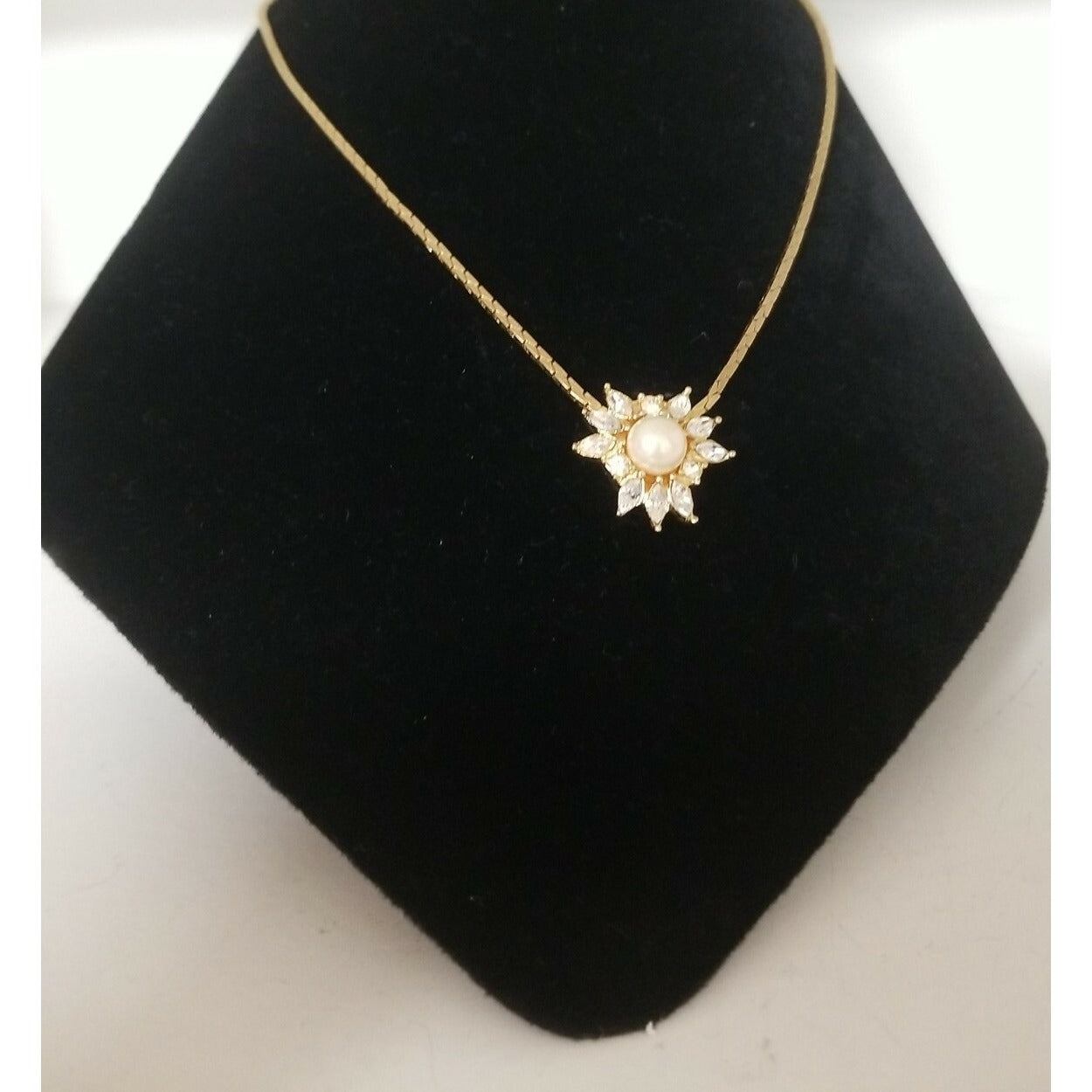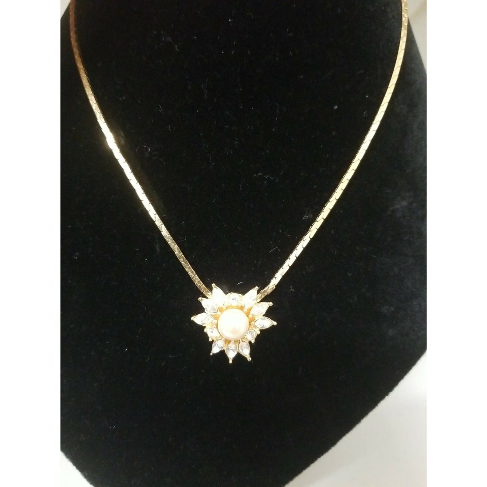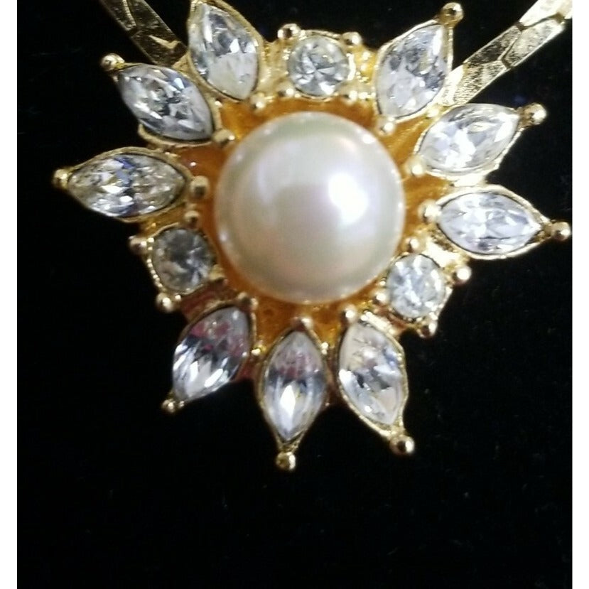 This vintage pearl starburst necklace features a stunning faux pearl center surrounded by clear navette rhinestones, creating a radiant sunburst design. Crafted in elegant gold-tone metal, the pendant hangs from a delicate matching chain with an adjustable clasp for the perfect fit. Charming and timeless, this piece brings classic vintage glamour to any outfit—ideal for special occasions, gifting, or adding a touch of sparkle to your collection.