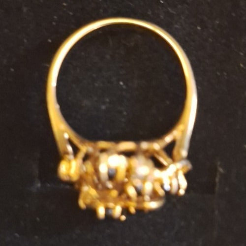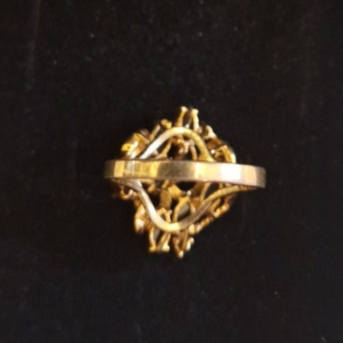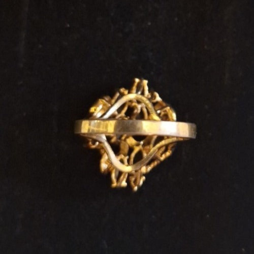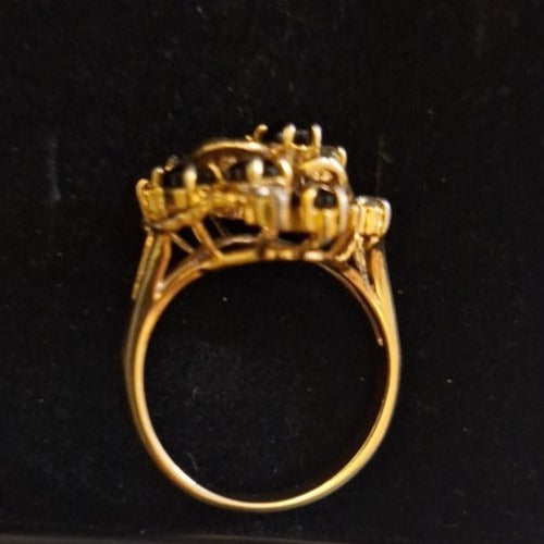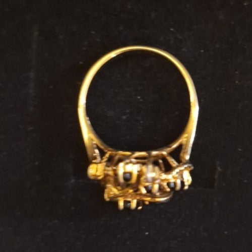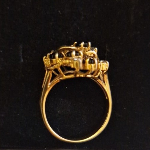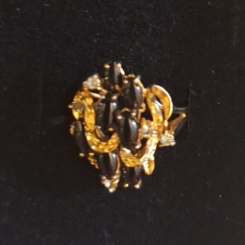 This vintage black marquise cluster ring features bold faux onyx stones accented with clear rhinestones for striking contrast. The raised ornate setting gives it a dramatic cocktail-style look, perfect for gothic glam, evening wear, or statement outfits. Beautiful vintage craftsmanship with intact stones.