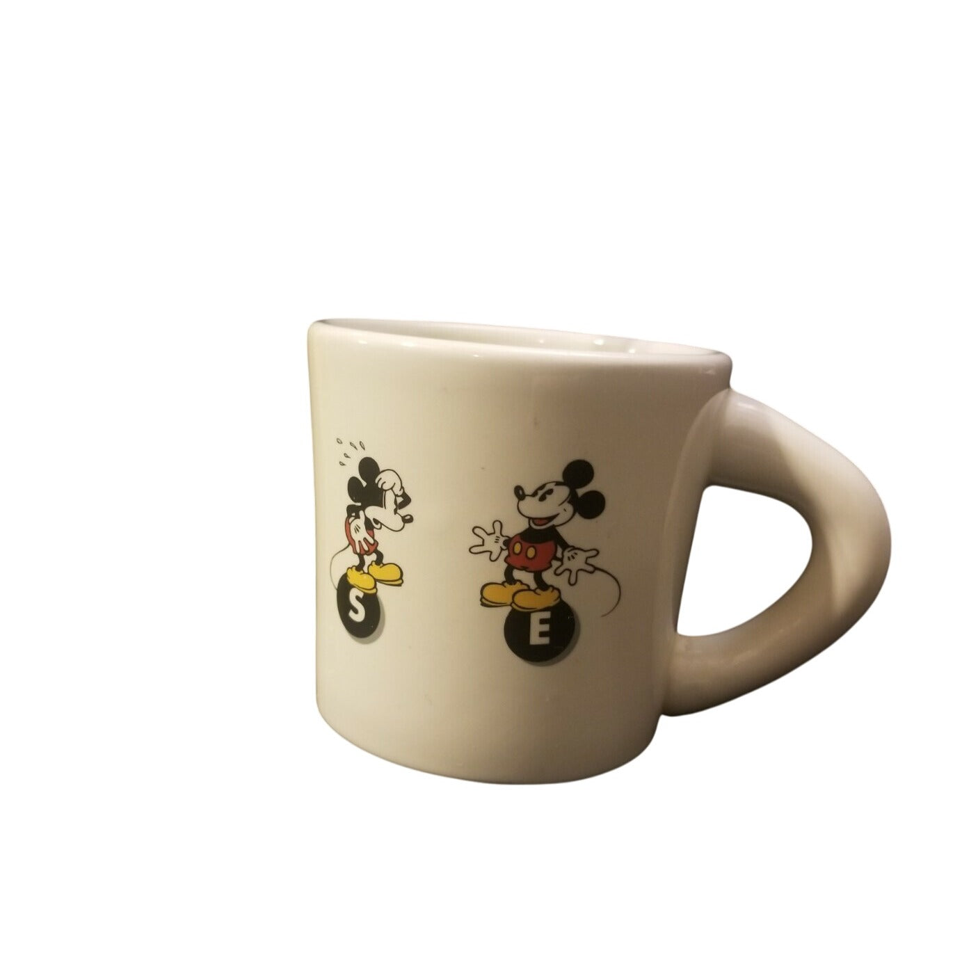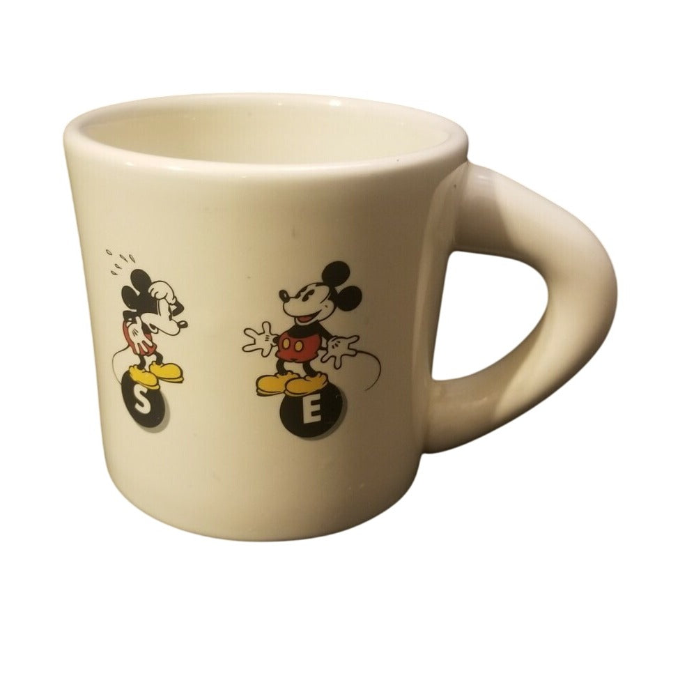 This vintage Mickey Mouse ceramic mug is a collectible piece featuring classic cartoon designs.