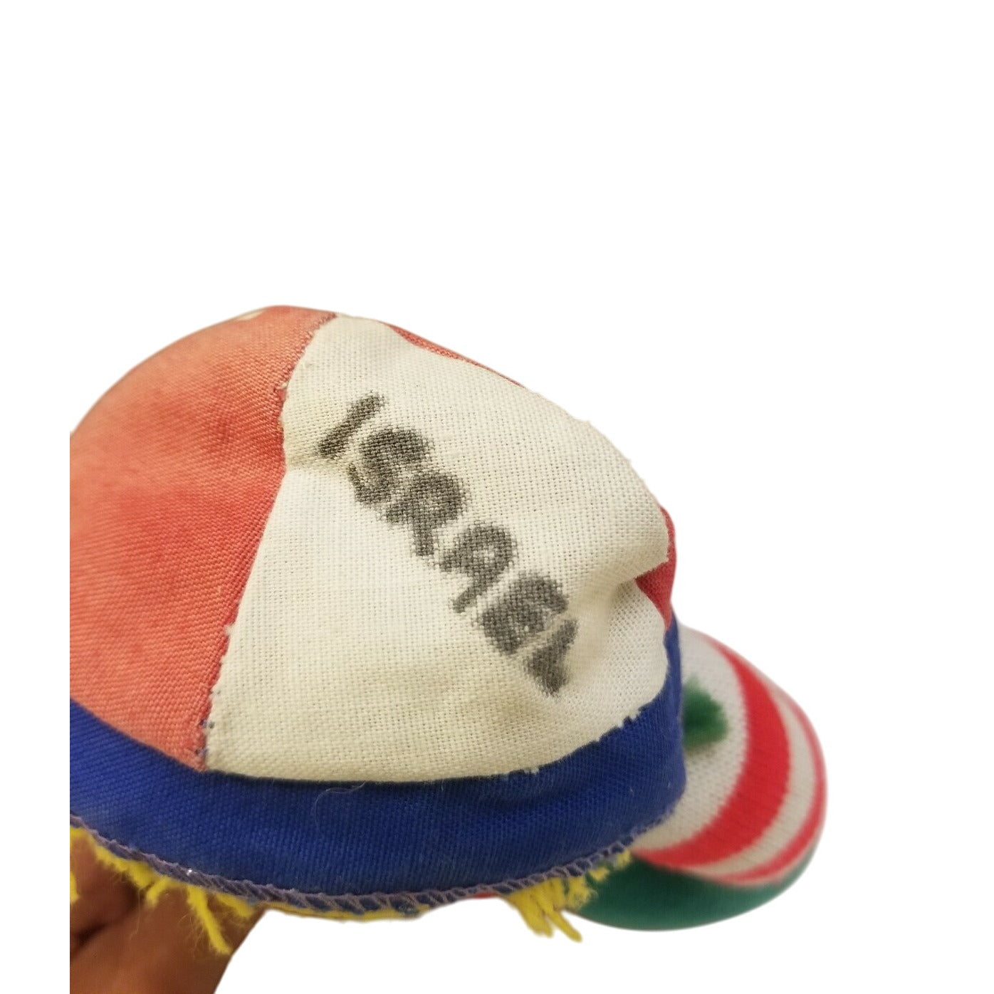 Good - Pre-Loved.Β Minor fabric wear on the hat; slight discoloration on white areas due to age.