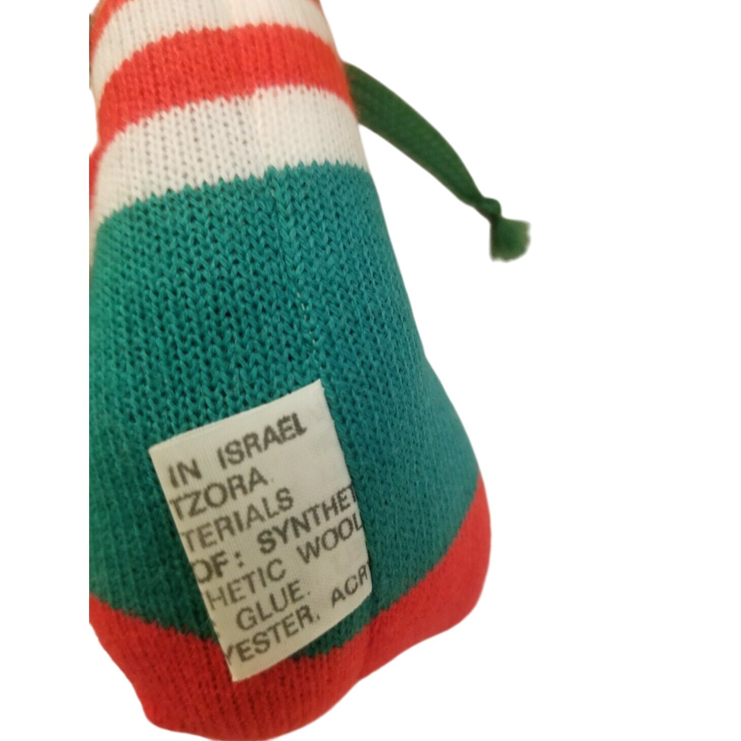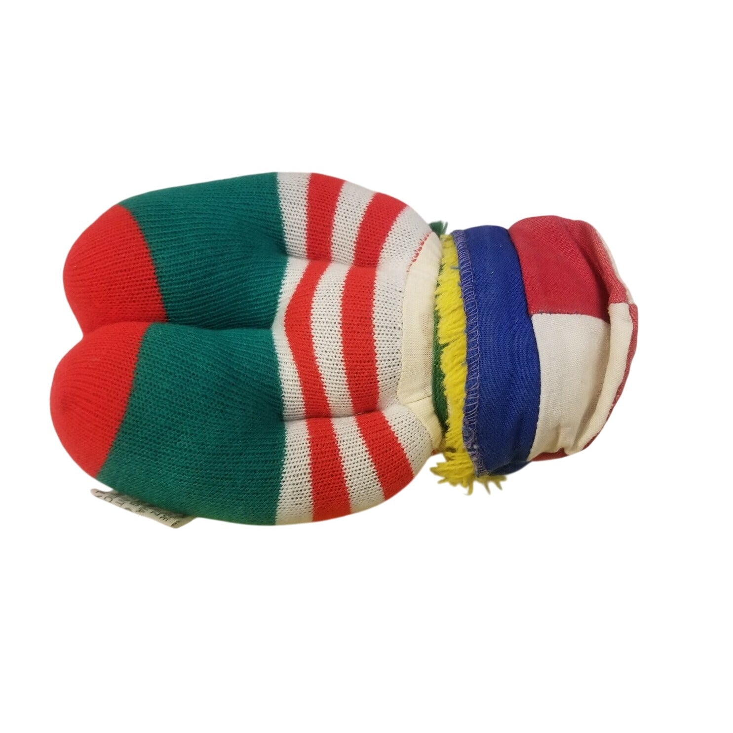 This vintage handmade cloth doll is crafted with colorful striped patterns and soft materials. A unique collectible or decorative piece showcasing Israeli craftsmanship.